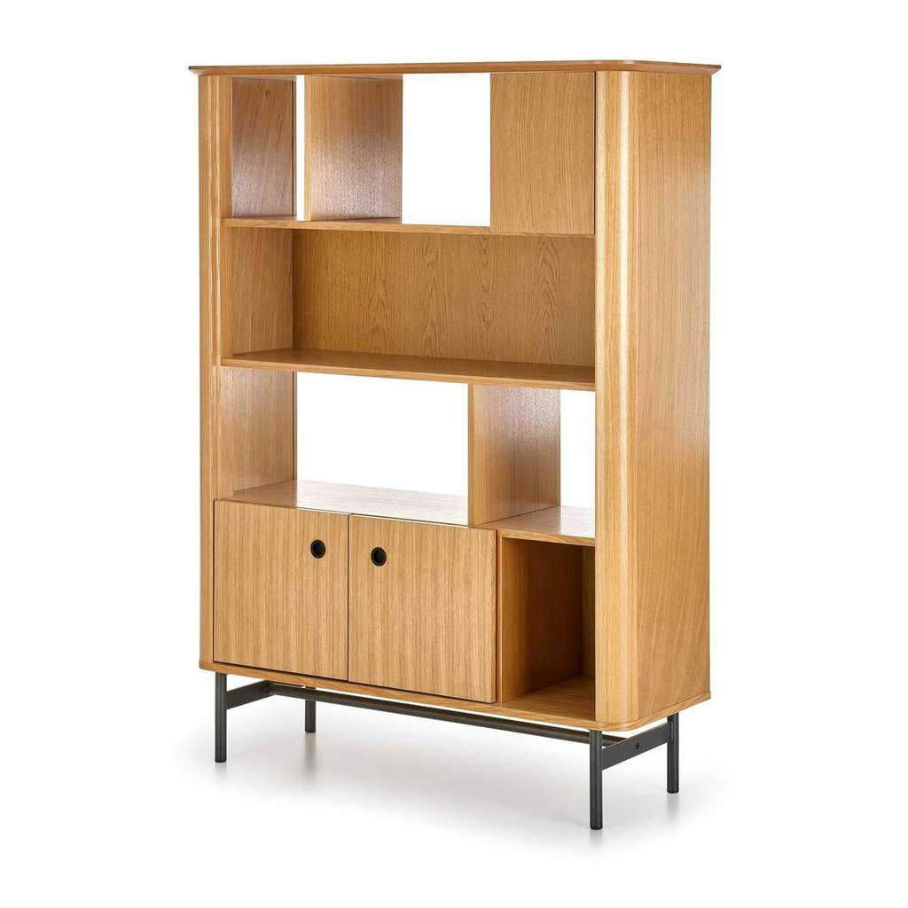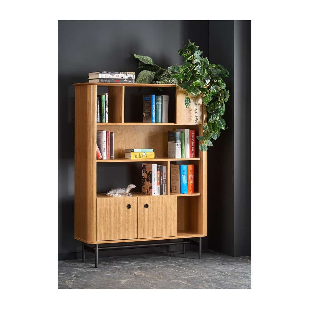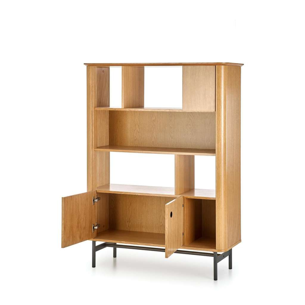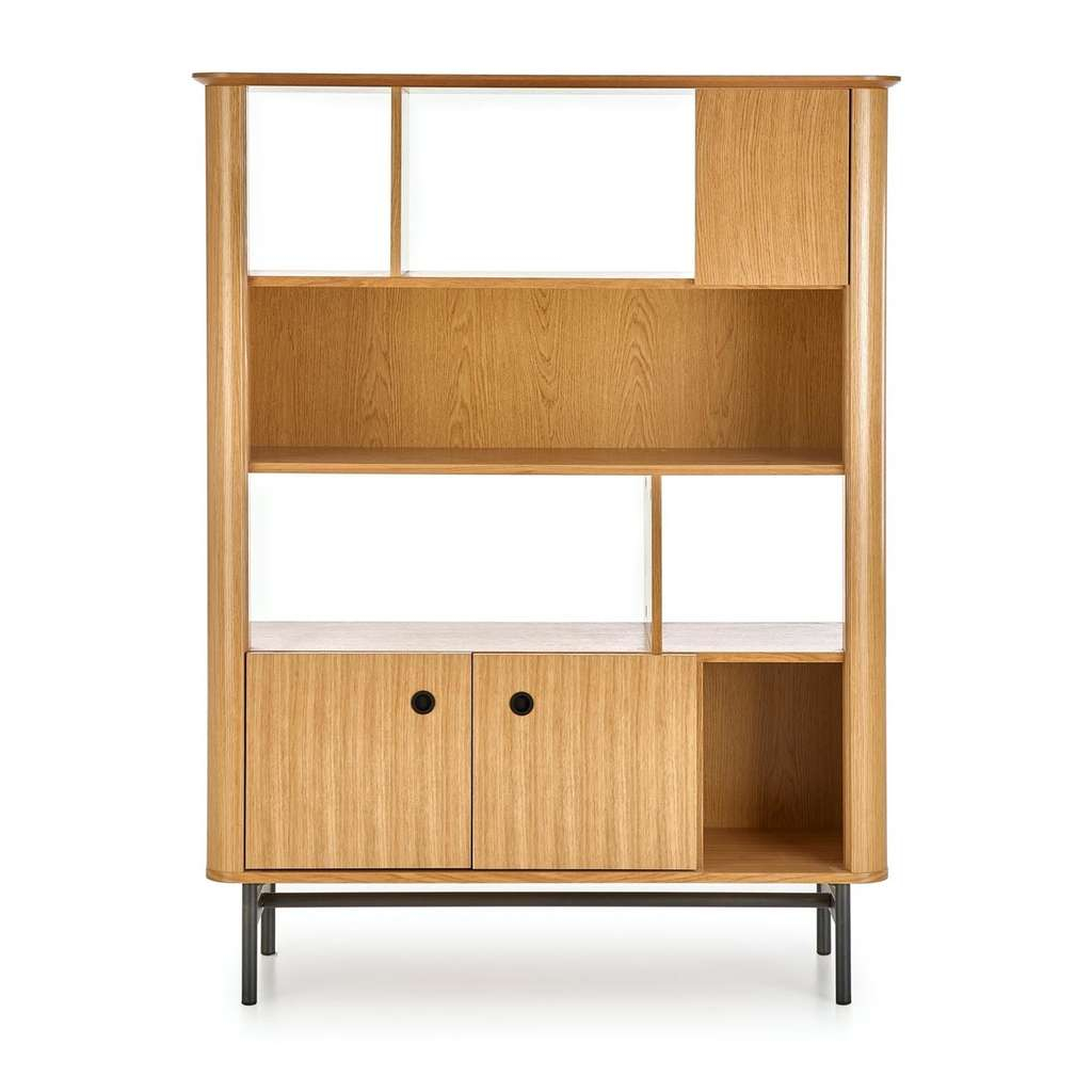 Jeho promyšlený design s otevřenými i uzavřenými policemi vám umožní efektivně uspořádat knížky, dekorace nebo méně viditelné předměty. Stabilní konstrukce na kovových nohách zároveň zajišťuje dlouhou životnost a odolnost regálu.