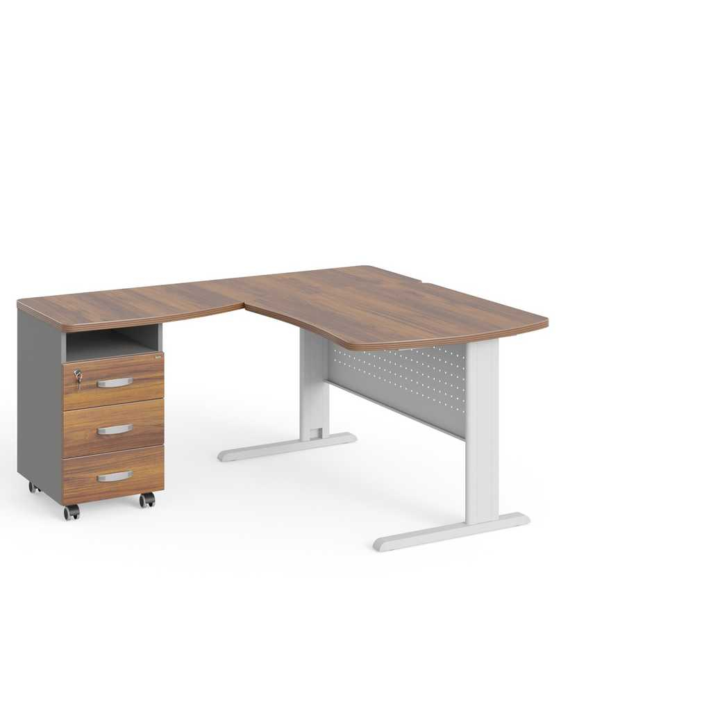Rohové místo se skládá z pracovní desky ve tvaru L a z kontejneru, který je umístěn na kolečkách. Ten obsahuje celkem 3 zásuvky s centrálním zamykáním.