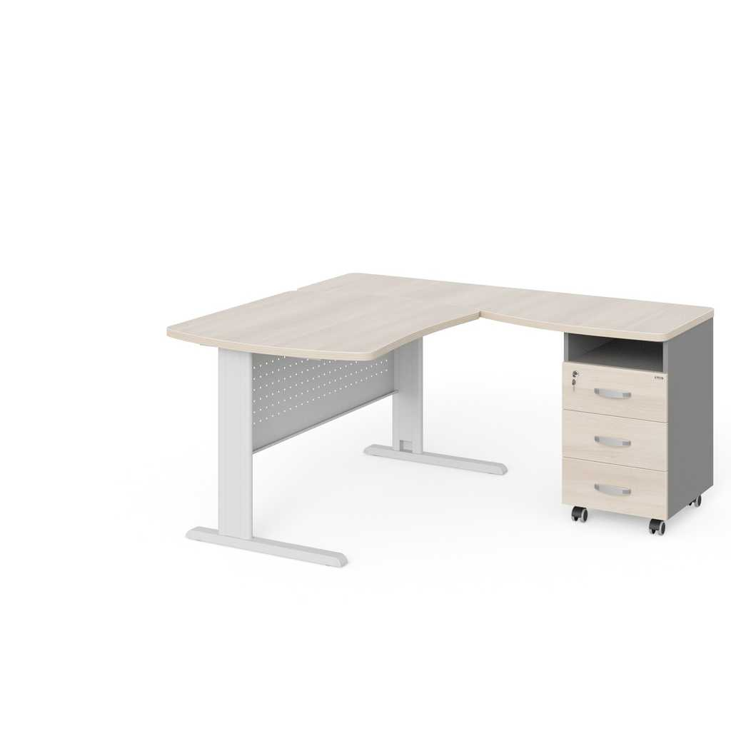 Rohové místo se skládá z pracovní desky ve tvaru L a z kontejneru, který je umístěn na kolečkách. Ten obsahuje celkem 3 zásuvky s centrálním zamykáním.
