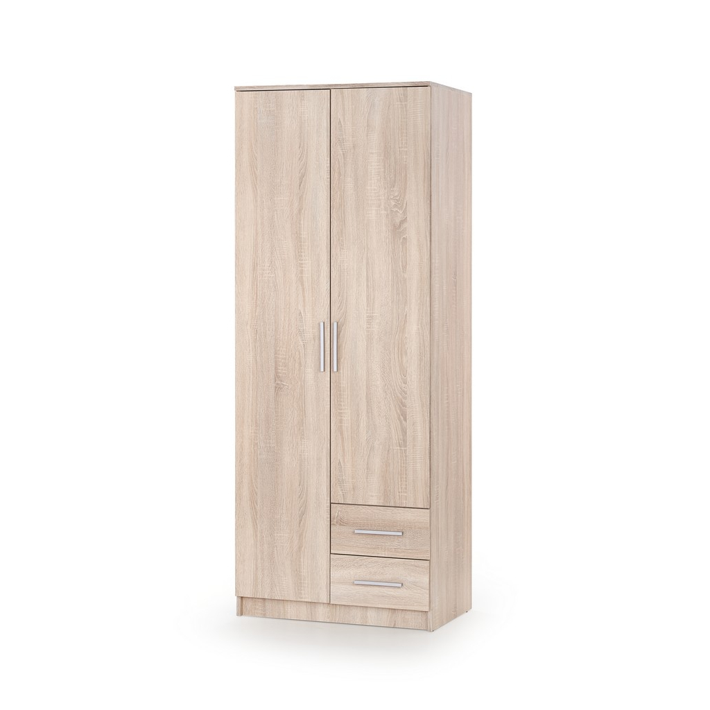 Konstrukce šatní skříně je vyrobená z laminovaných desek ve vysokém lesku s ABS hranou. Dodáváme ji ve 3 barevných provedeních - v bílé, dubu sonoma a v kombinaci bílé s dubem sonoma.