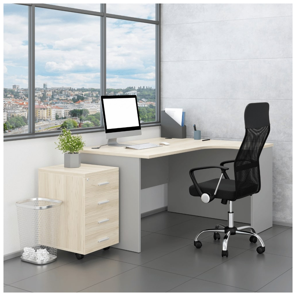 Sestavu SimpleOffice 2 tvoří rohový pracovní stůl (v tomto případě pravý) a pojízdný kontejner se 4 zásuvkami. Společně položí základy vašeho kancelářského pracoviště a zajistí vám spoustu úložného i pracovního prostoru. K dokonalosti už potom schází jen pohodlná židle.