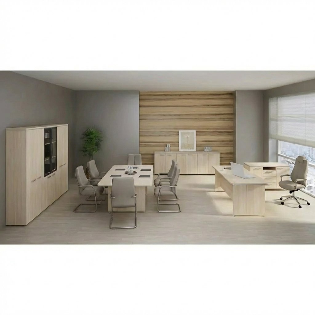 Nábytková sestava TopOffice 6 se skládá z kancelářského stolu, jednacího stolu, pojízdného kontejneru a šesti skříní. Sestava obsahuje kombinovanou vysokou širokou skříň, dvě vysoké široké skříně a tři nízké široké skříně. Ke skříním v této sestavě dodáváme čtvery dřevěné dveře s výškou 193,2 cm, šestery dřevěné dveře s výškou 76,8 cm a horní i boční obkladové desky ve zvoleném dezénu.