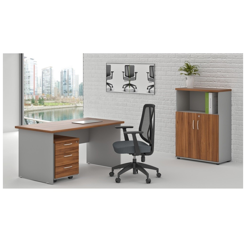 Nábytková sestava Visio LUX 2 se skládá z kancelářského stolu, pojízdného kontejneru a střední skříně. Skříň je vybavena nižšími dveřmi, díky čemuž vznikne prostor pro rychlý přístup.
