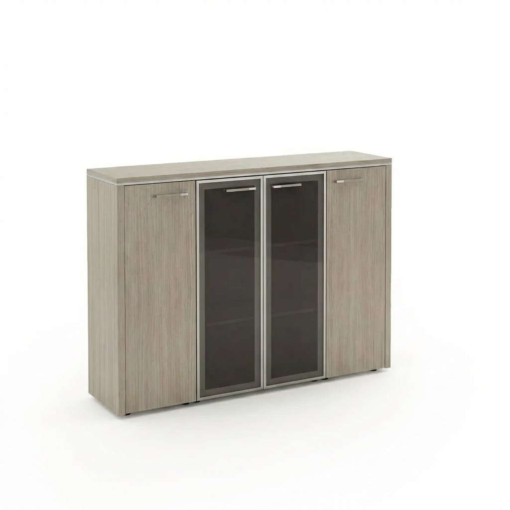 Sestava skříní TopOffice 8 se skládá ze střední široké skříně, která je vybavena skleněnými dveřmi a dvou středních úzkých skříní, které disponují dřevěnými dveřmi. Ke skříním dodáváme také obložení pro horní i boční strany ve vybraném dezénu.