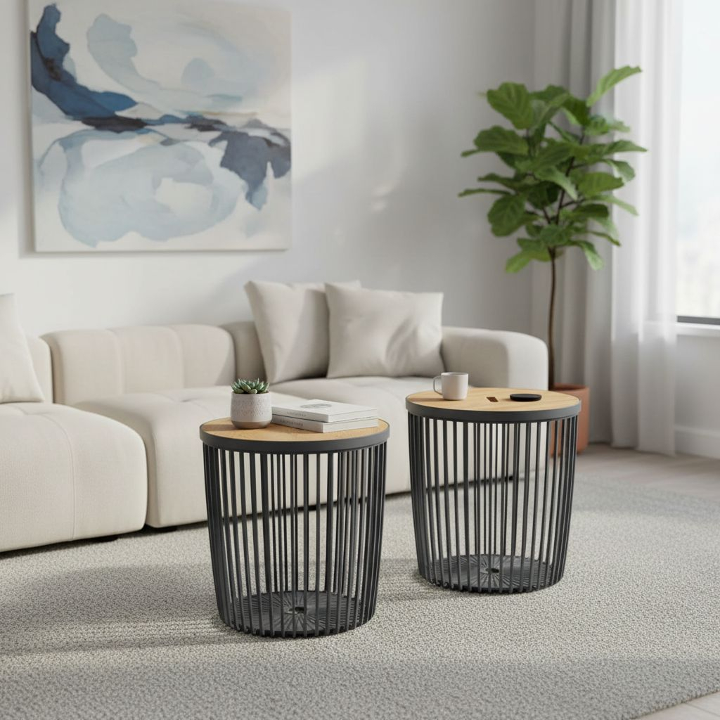Úložné prostory, nebo odkládací stolky? Rozhodněte se sami! Tyto univerzální koše nabízí několik řešení v jednom produktu. Využijte je jako stolky pro odložení šálku kávy a klidně do nich uschovejte třeba deky. Koše jsou vyrobeny z pevného plastu a odnímatelná víka z bambusu. Průměr vík je 33,5 a 38,6 cm.