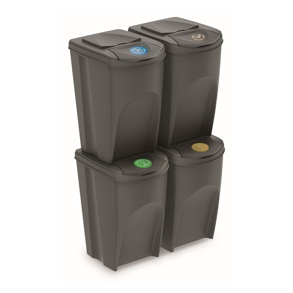Tento set na tříděný odpad se skládá ze 4 plastových nádob s objemem 35 l. Zásluhou možnosti stohování nezabere tento modulární systém košů příliš mnoho místa v prostoru. Koše dodáváme s barevnými nálepkami pro snadné odlišení typu odpadu.