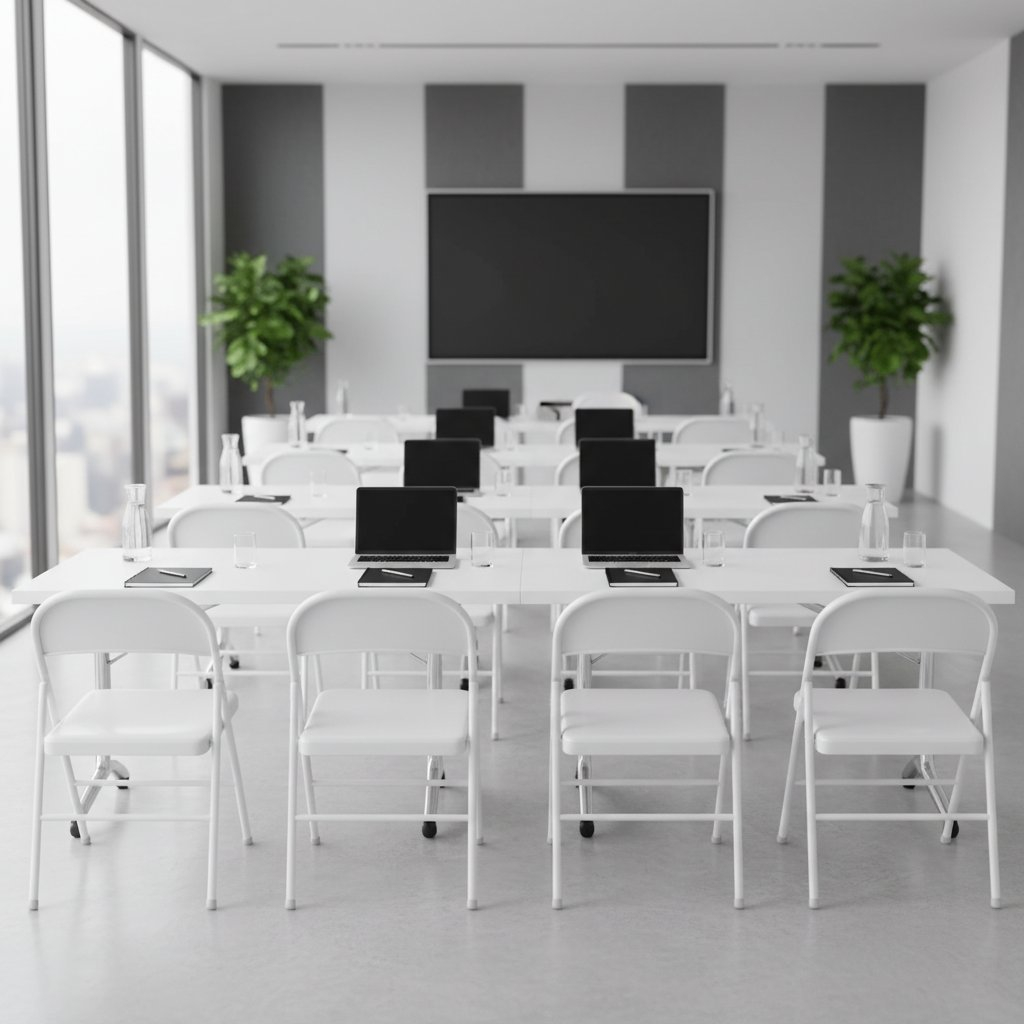 Jednoduchá skládací konstrukce umožňuje rychlé rozložení i složení, takže je ideální pro různé příležitosti, jako jsou školení, konference nebo různé společenské události. Židle neobsahuje područky, díky čemuž je kompaktní a praktická do menších prostor.