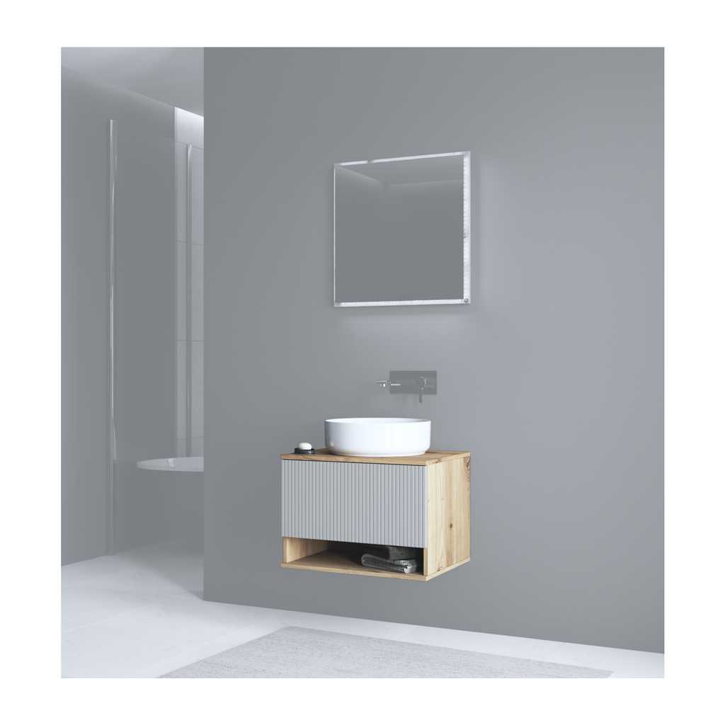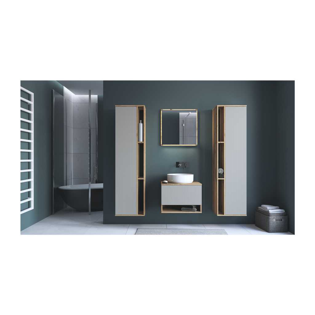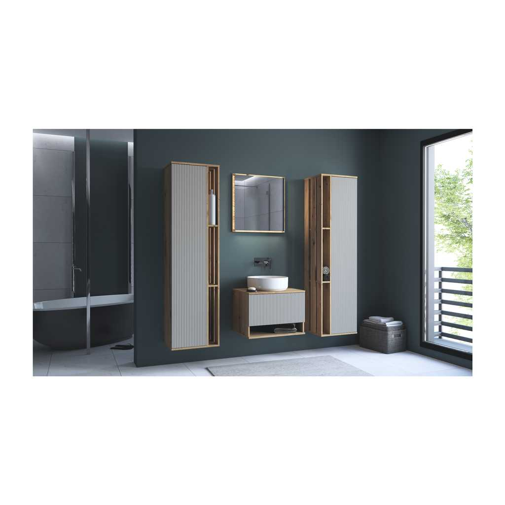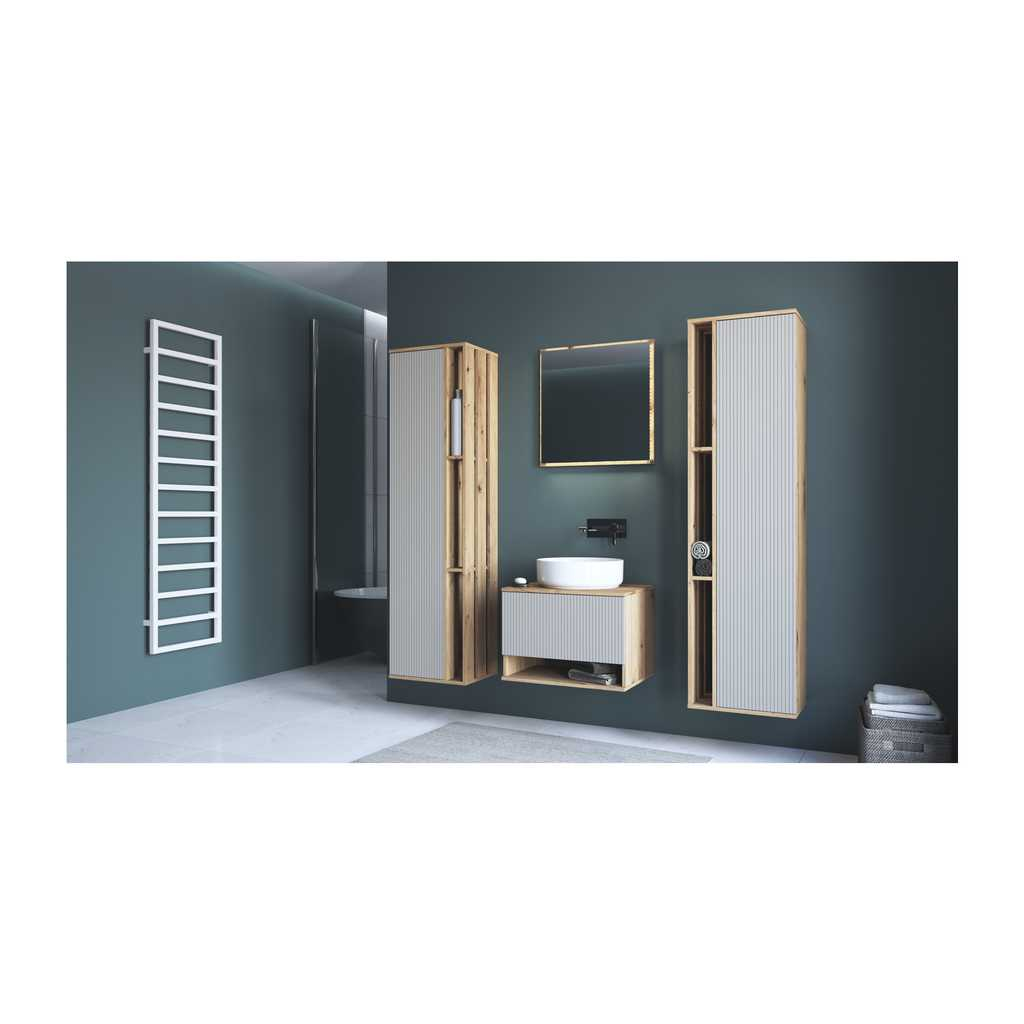Díky modernímu designu skříňky se hodí do různých koupelnových stylů a přináší do prostoru příjemnou atmosféru. Nabízí dostatek úložného místa pro nezbytnosti pod umyvadlem a je vybavena praktickou zásuvkou a otevřeným policovým prostorem.