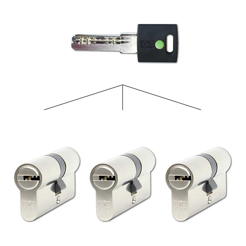 Toto balení obsahuje 3 stavební vložky na stejný klíč. Toto řešení je ideální pro dveře s více zámky nebo místnosti s několika vchody, ke kterým nechcete nosit další klíče. Na výběr máte z několika barevných označení klíčů, takže pokud si těchto sad pořídíte více, snadno si v nich udržíte přehled.
