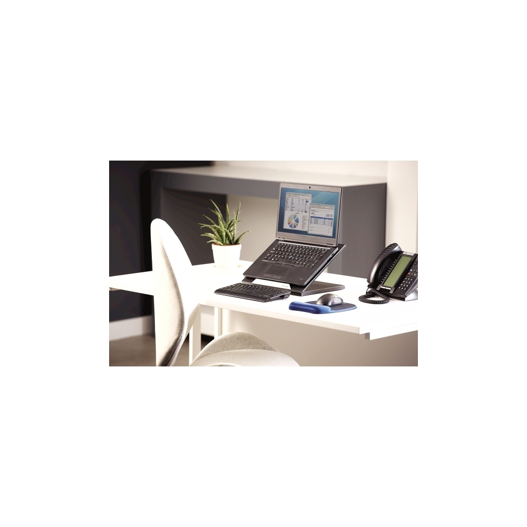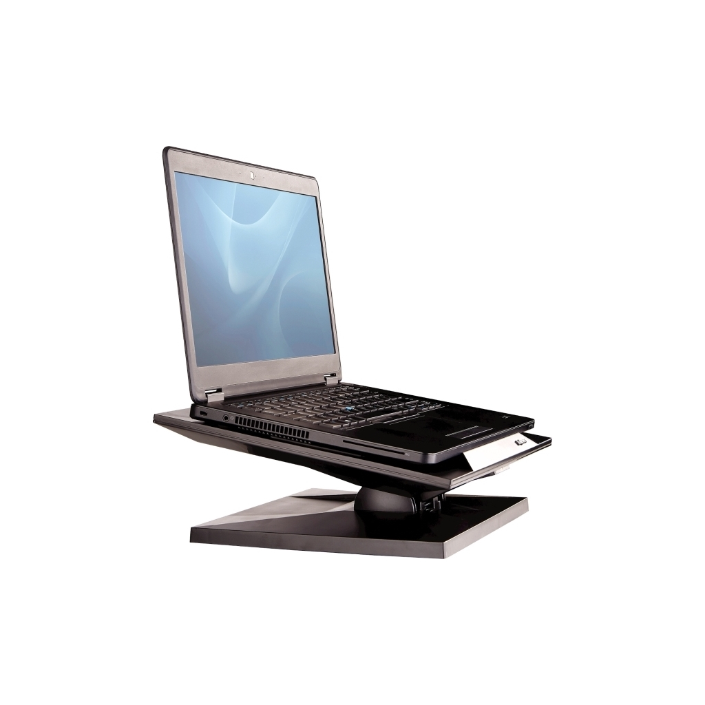 Výřez ve spodní ploše stojanu podporuje proudění vzduchu, čímž zabraňuje přehřátí přístroje. Čelní stabilizační hrana zamezuje sklouznutí notebooku. Stojan na notebook Fellowes Designer Suites má nosnost 11,3 kg a je vhodný pro notebooky s maximální úhlopříčkou 17".