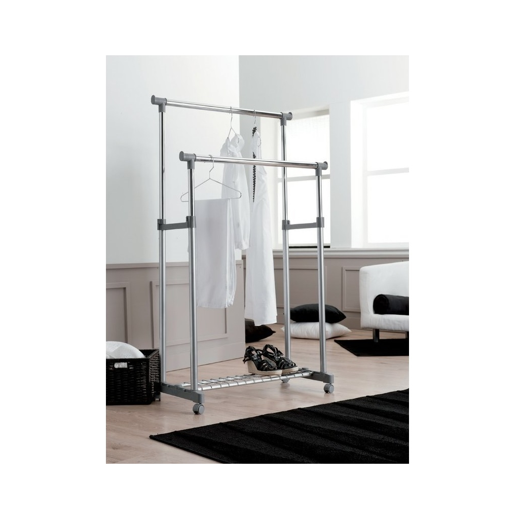 Stojan je vyroben v kombinaci kovu s plastovými částmi. Disponuje 2 tyčemi pro zavěšení oděvů a spodní mřížkou na uložení bot. Výhodou stojanu je možnost výškového nastavení obou závěsných tyčí od 91 do 160 cm. Pro snadnou manipulaci po prostoru jistě oceníte také kolečka.