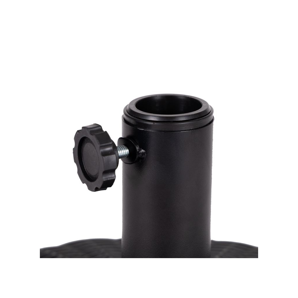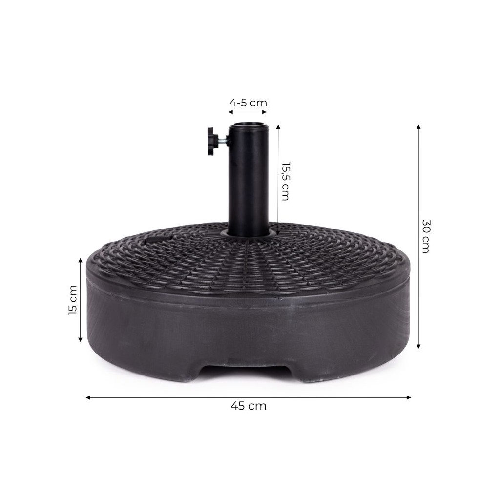 Základna má rozměry 45 × 15 cm (průměr × výška), průměr hrdla je pak 50 mm. O stabilitu slunečníku se postará dvojice jisticích kroužků určených pro slunečníky s tyčí o síle 40 mm nebo 50 mm.