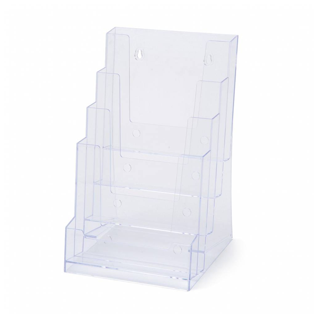 Plastový stojánek na letáky ve formátu A5 je skvělým řešením pro prezentaci reklamních letáků či jiných tiskovin, a to nejen v kancelářském prostředí. Tento moderní nástroj je vyroben z kvalitního plastu a disponuje čtyřmi úložnými kapsami. Stojánek je určen k vystavení na viditelné místo, kde se díky svému zpracování stane snadno středem pozornosti. Vhodný také pro připevnění ke zdi.