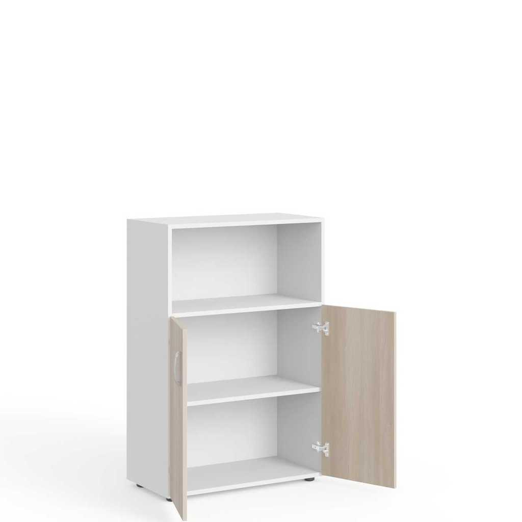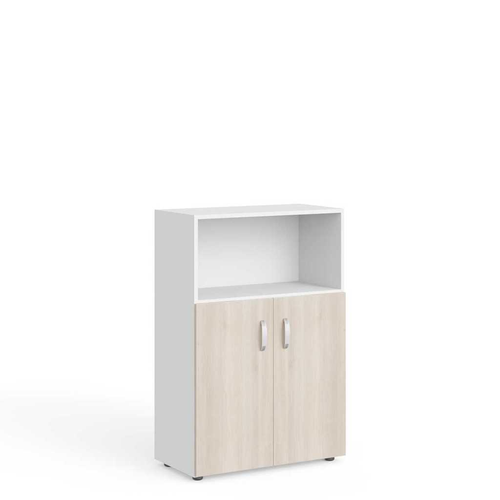 Skříň je dodávána společně se spodními dřevěnými dveřmi, které jsou vybaveny plastovými úchytkami. Horní část skříně je odkrytá a nabízí rychlý přístup. Pro sjednocení elegantního vzhledu vaší kanceláře si však můžete objednat obkladovou desku.