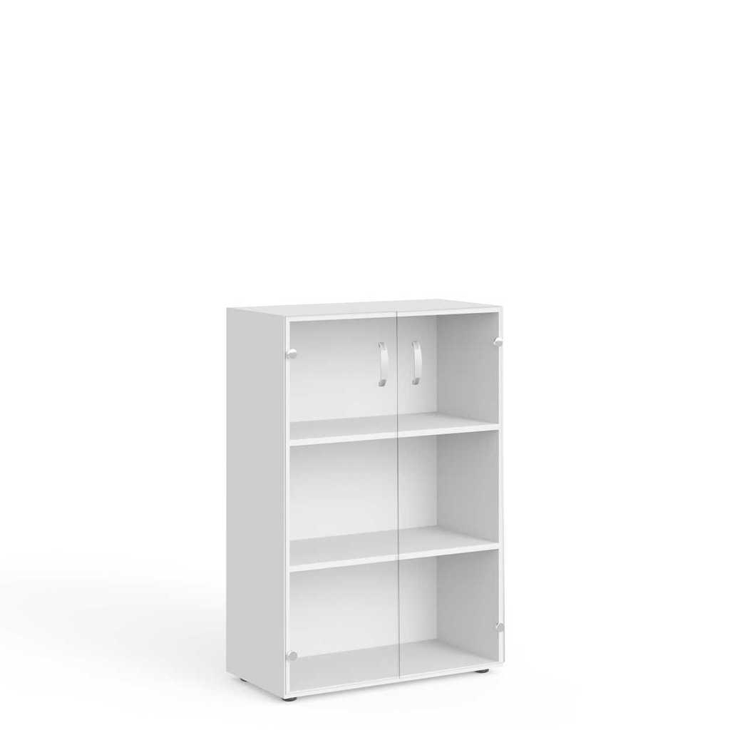 Skříň je dodávána společně se skleněnými dveřmi, které jsou vybaveny plastovými úchytkami. Standardně ji nabízíme s šedým korpusem. Pro sjednocení elegantního vzhledu vaší kanceláře si však můžete objednat obkladovou desku.