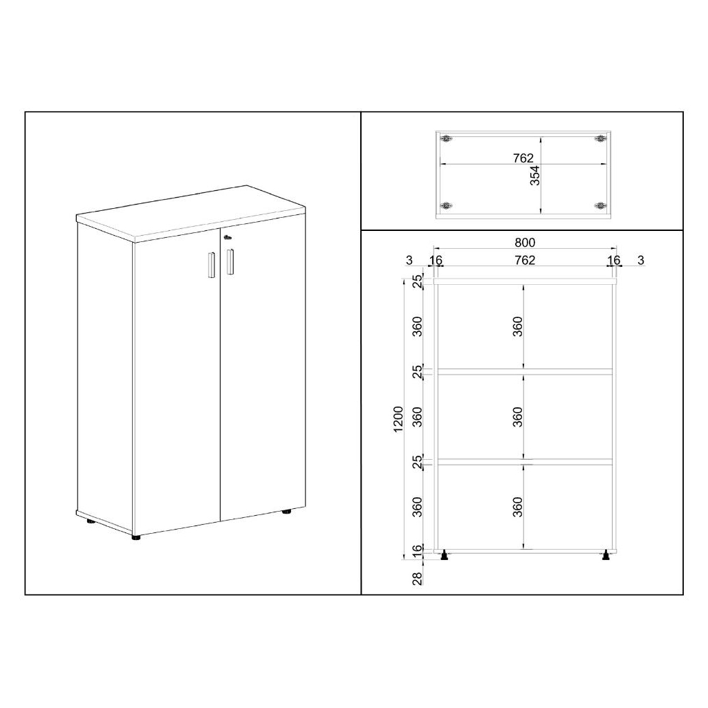 Prostor skříně je policemi rozdělený na 3 oddíly s vnitřními rozměry 76,2 × 35,4 × 36 cm (šířka × hloubka × výška).