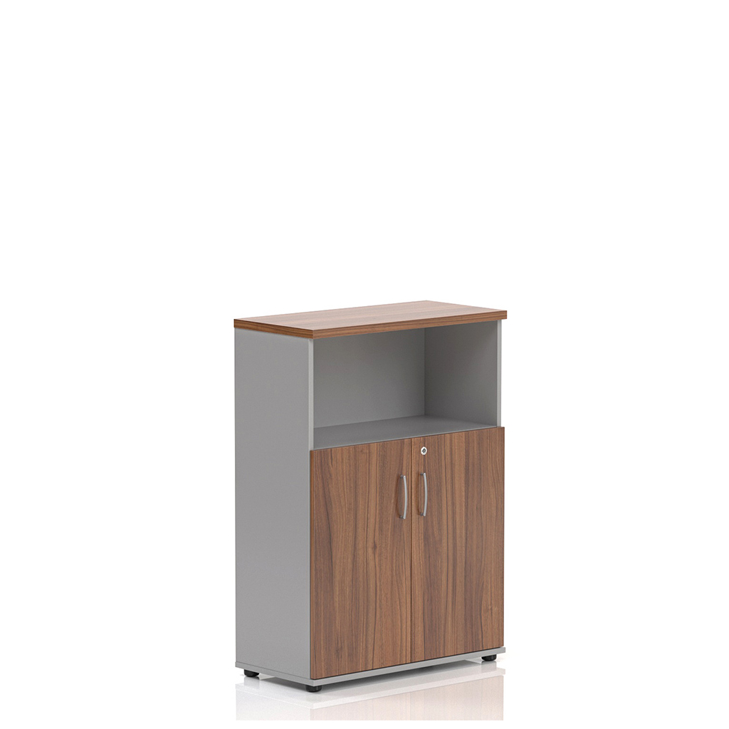 Skříň dodáváme s uzamykatelnými křídlovými dveřmi ve spodní části, které disponují kovovými úchytkami.