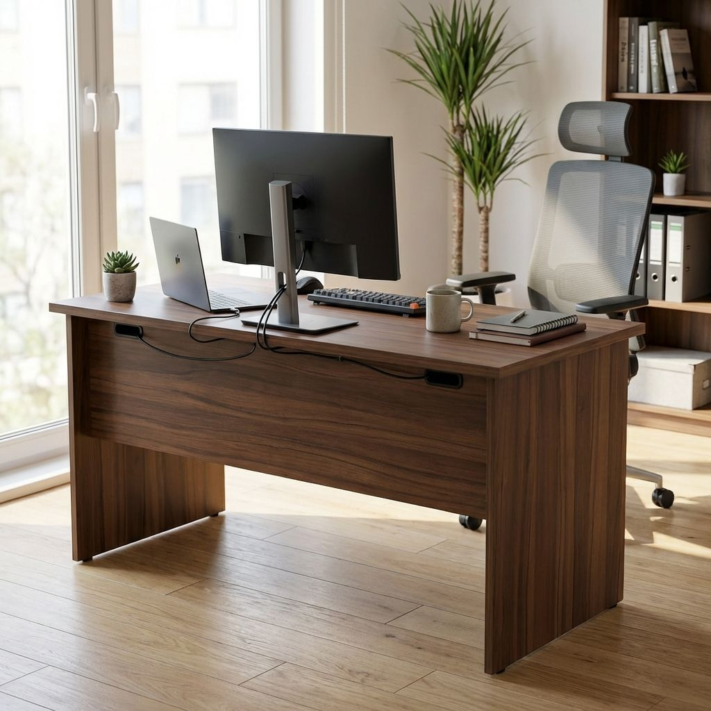 Vrchní deska je vyrobená z laminované dřevotřísky o síle 28 mm. Stůl disponuje mezi svou vrchní a čelní deskou praktickým otvorem, který poslouží pro vyvedení kabeláže.