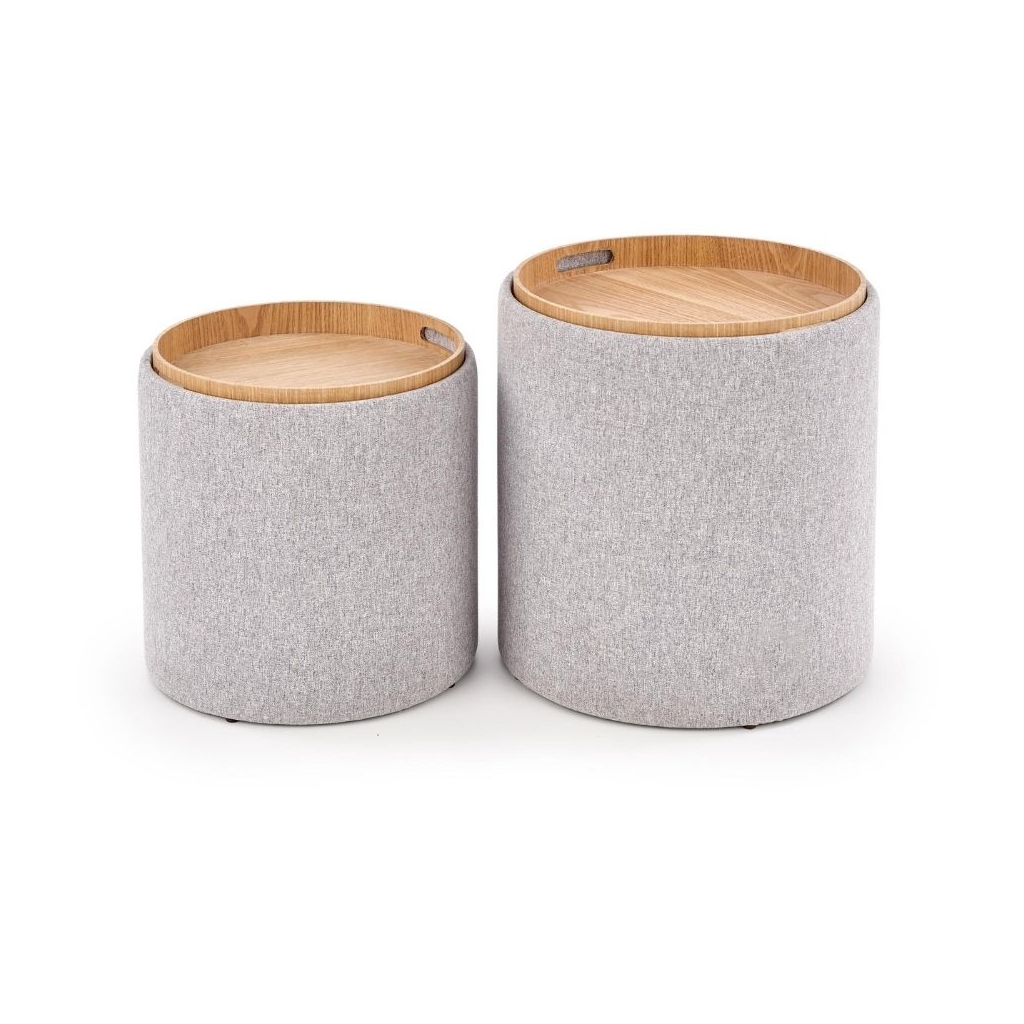Při koupi tohoto taburetu obdržíte hned 2 ks. Jeden větší s rozměry 38 × 45 cm a druhý o něco menší s rozměry 35 × 39 cm. Oba tyto taburety jsou vyrobeny kombinací látkového potahu a MDF desky. Uvnitř obou taburetů je skrytý úložný prostor. Velkou výhodou je i jejich víko, které můžete otočit a z taburetu tak vytvořit konferenční stolek.