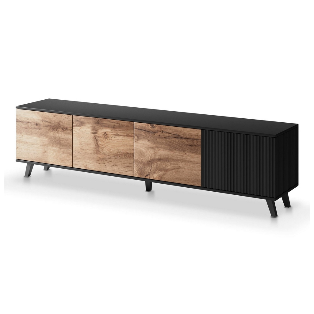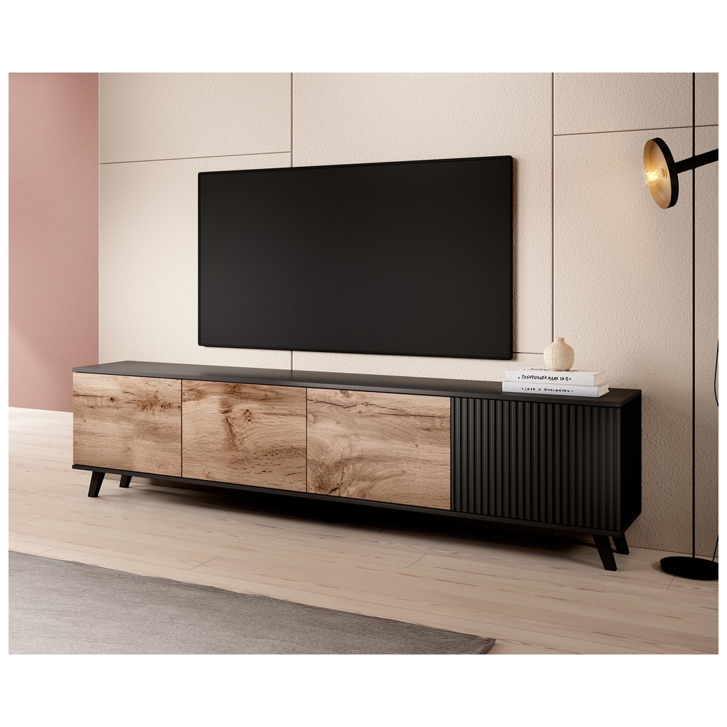 Desky stolku tvoří laminovaná dřevotříska a dřevovlákno (MDF) ve vkusné barevné kombinaci, vroubkovaná dvířka jsou pak z černého polypropylenu.