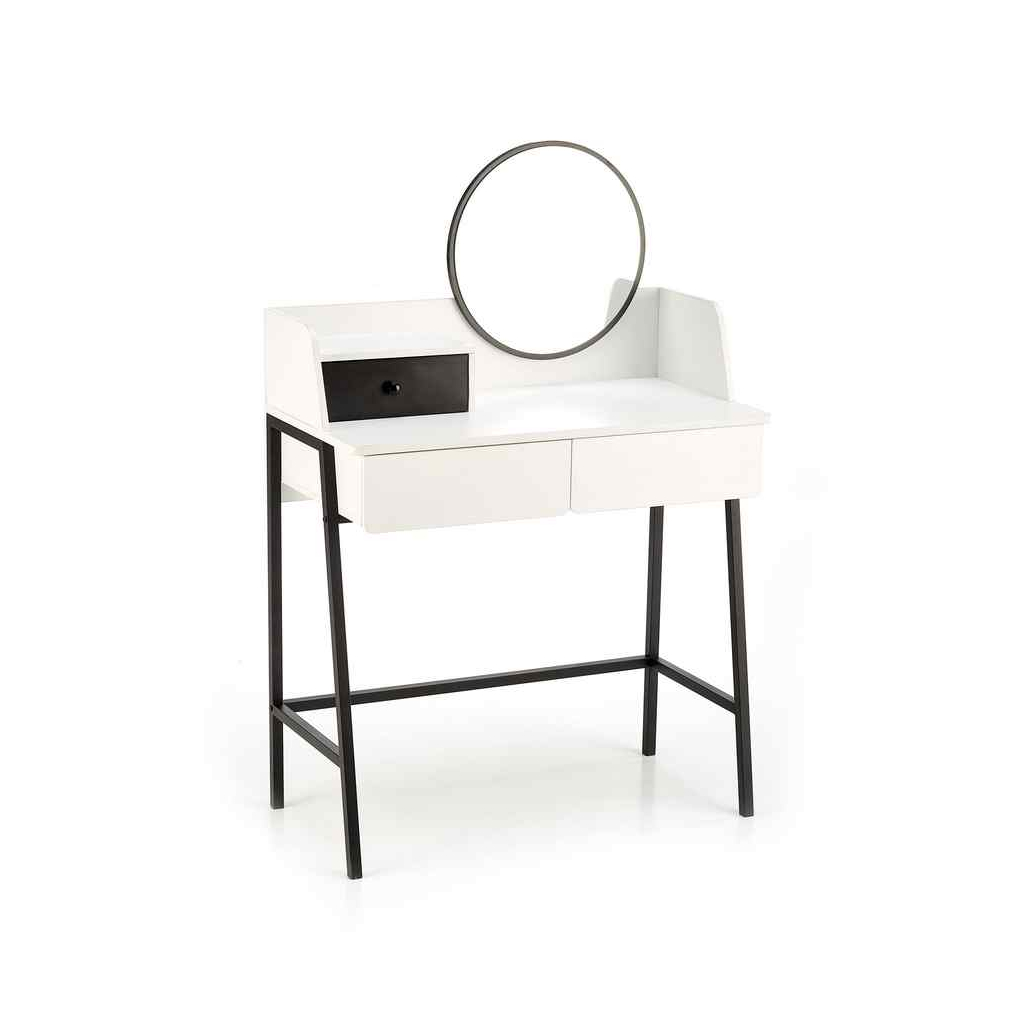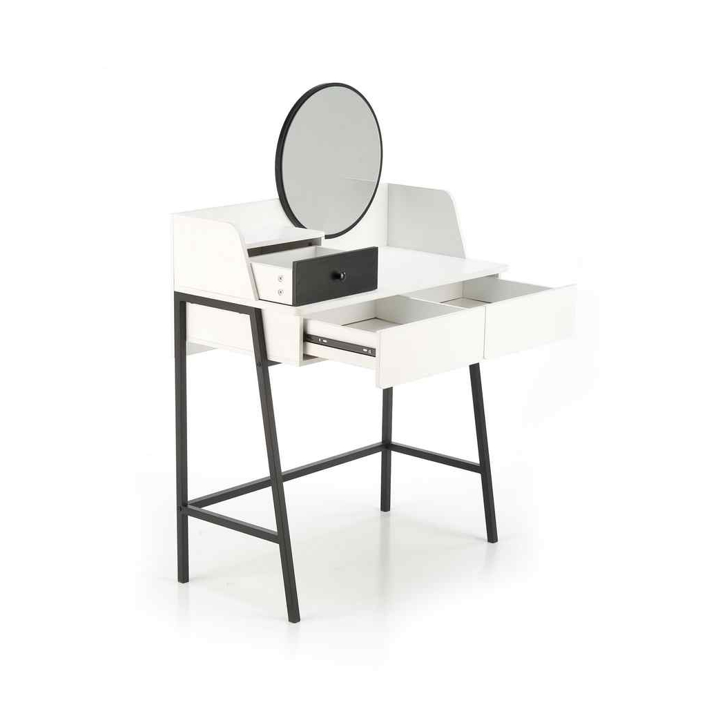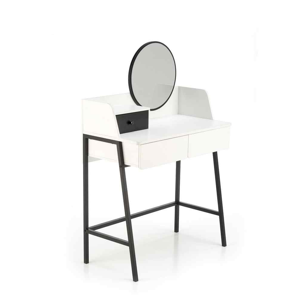 3 šuplíky. Stolek doplňuje kulaté zrcadlo.