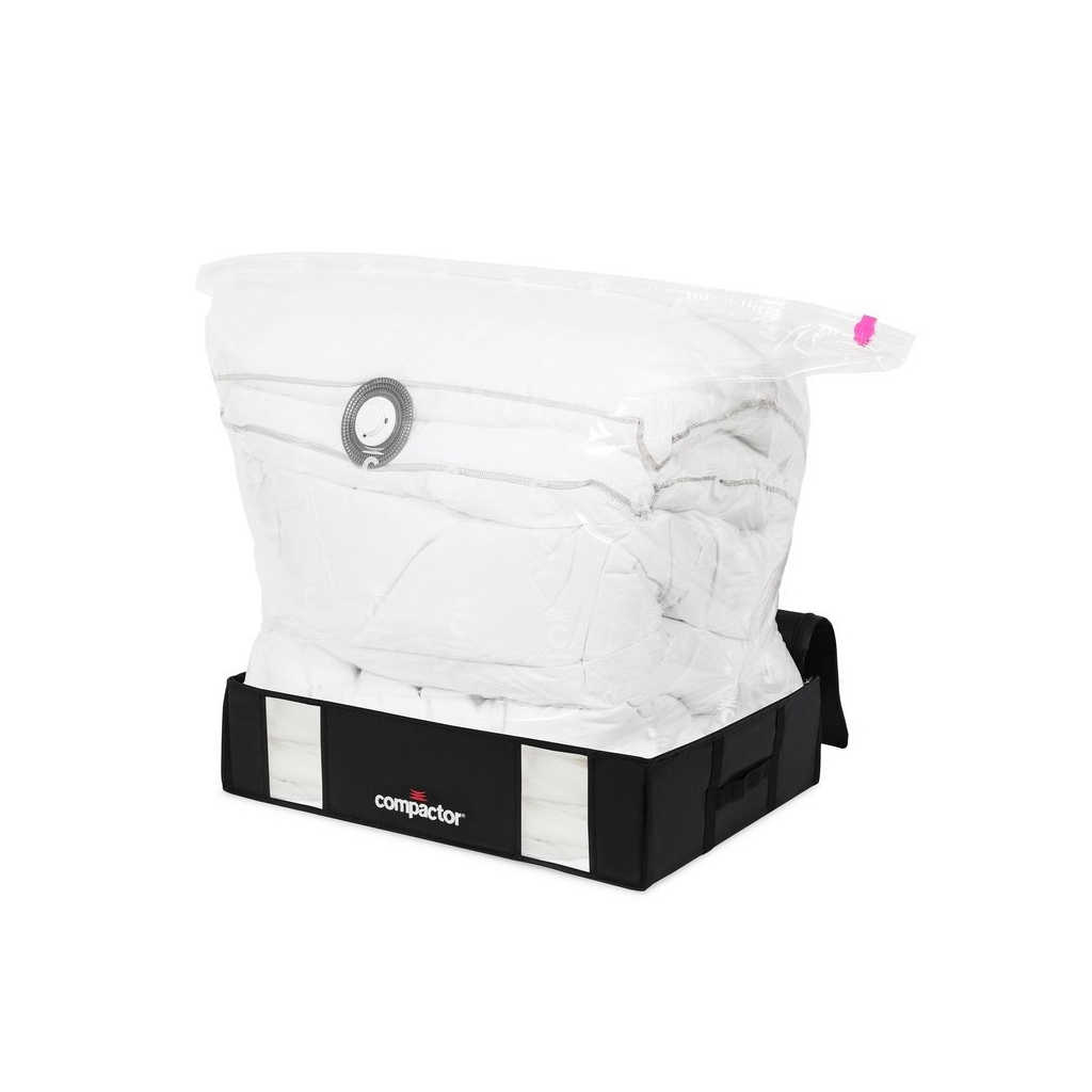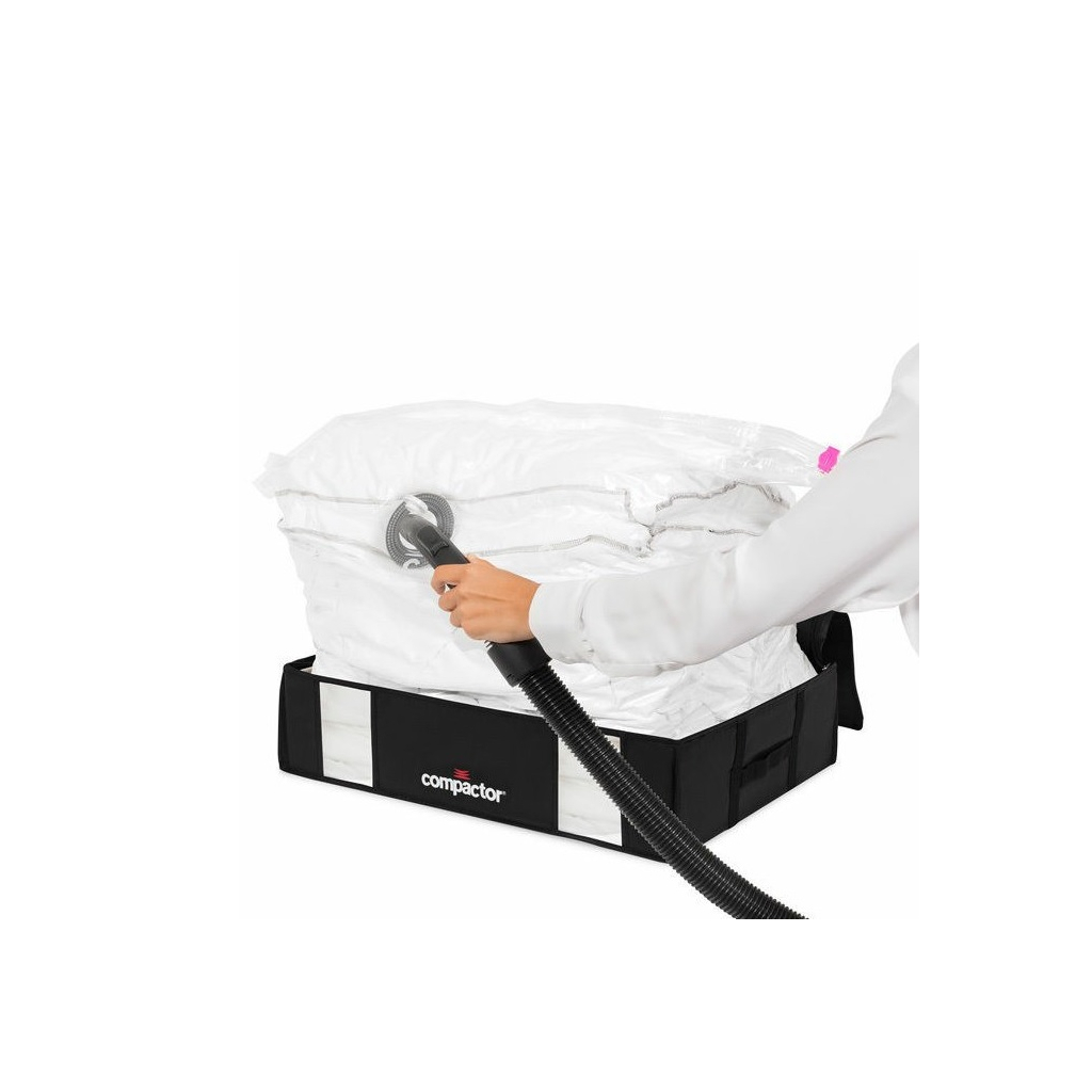 Kompresní vak je praktickým doplňkem do kanceláří i do domácností. Disponuje rozměry 65 × 50 × 15,5 cm a jeho největší výhodou je komprese uskladněných textilií až o 75 %.