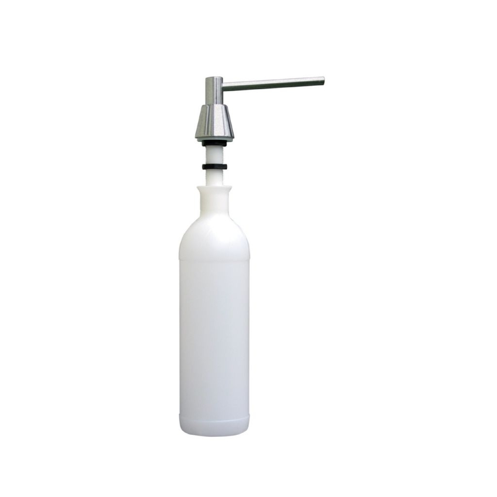 Tento dávkovač tekutého mýdla je praktickým řešením například do kuchyně nebo na veřejnou toaletu. Montuje se přímo na desku (její tloušťka nesmí přesáhnout 55 mm), přičemž samotný 1l zásobník je skryt pod ní. Nad úrovní pracovní desky zůstává pouze elegantní otočná pumpička z pochromované mosazi.