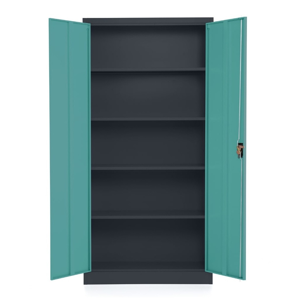 Konstrukce je vyrobena z pevného ocelového plechu a dodáváme ji v několika barevných provedeních dvířek. Jedná se o standardizované odstíny RAL. Korpus je u této varianty skříně v barvě RAL 7016 (antracitová).