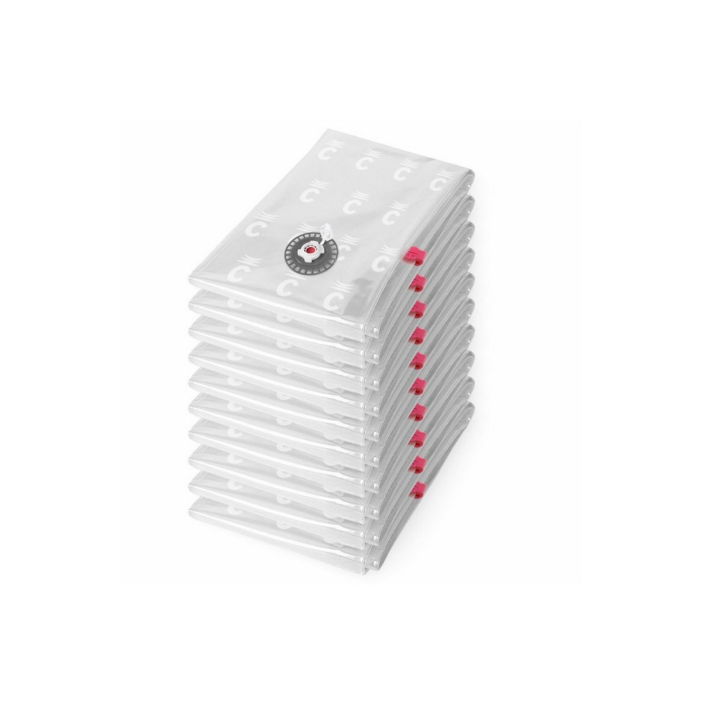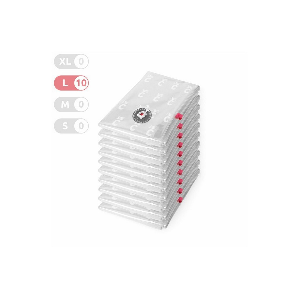 Balení obsahuje 10 kusů vakuových pytlů velikosti L (120 l). Pohodlně tak do vaků umístíte běžné přikrývky i polštáře.
