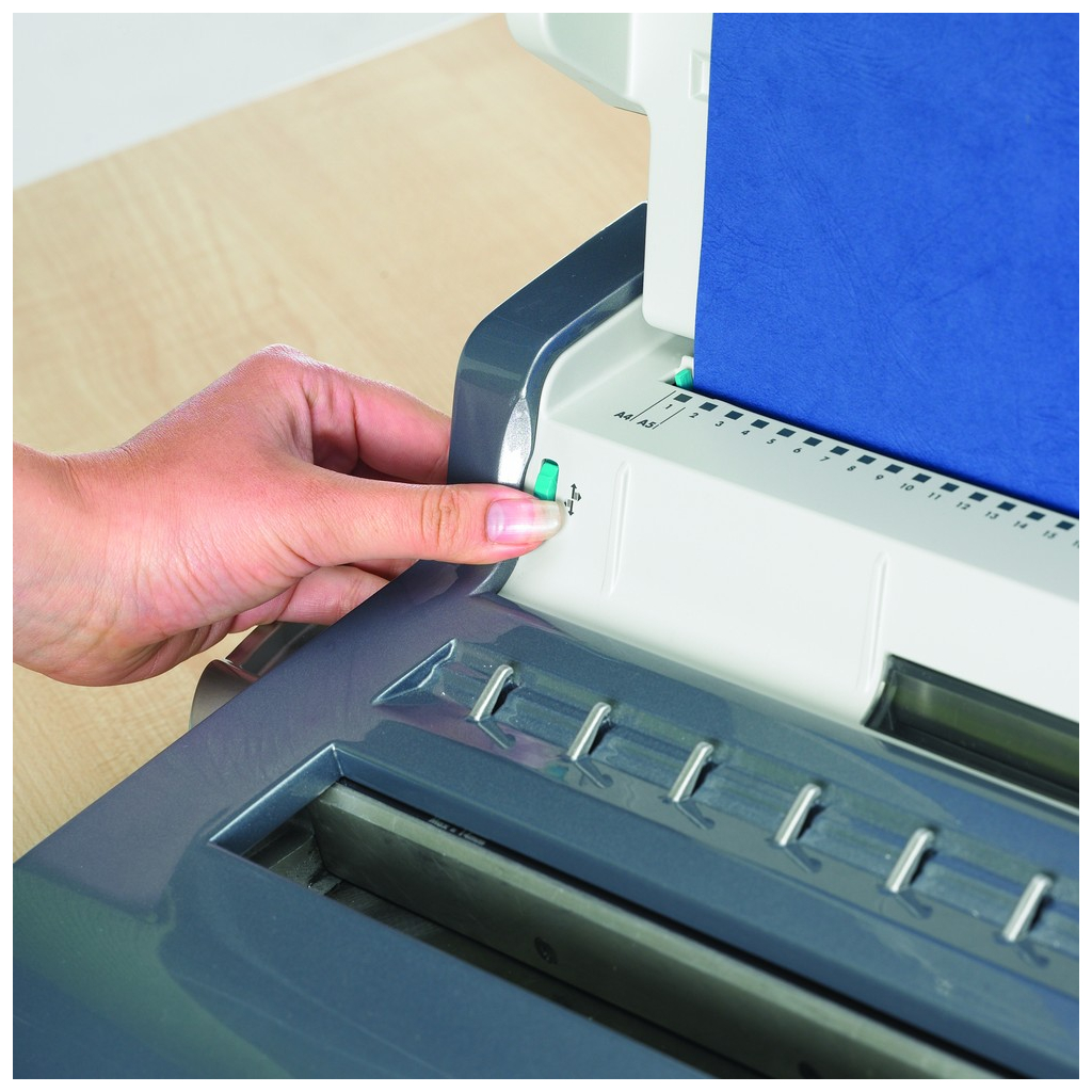 Děruje otvory s rozměry 3 × 4 mm, přičemž do papíru formátu A4 jich vyděruje 34. Maximální počet papíru, které můžete najednou vložit do stroje pro děrování, je 15. Jednoduchou obsluhu vám navíc zpříjemní ergonomická rukojeť páky pro vázání a děrování. Pomocí měřítka zjistíte tloušťku vazby, což vám ulehčí výběr správného průměru kovového hřbetu. Díky praktickým rozměrům se s přístrojem jednoduše manipuluje a je snadno skladovatelný.