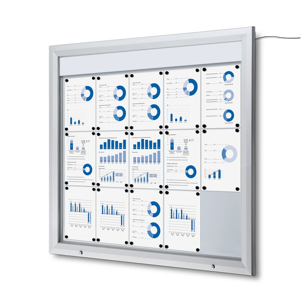 Vitrína ve formátu 15 x A4 disponuje magnetickým popisovatelným povrchem, který je nasvícen pomocí technologie LED. Vložený obsah se tak stane nepřehlédnutelným a kolemjdoucí spolehlivě zaujme i v noci. Povrch je určen pro popisování za sucha stíratelnými popisovači. Kromě psaní však můžete využít také magnetů pro připnutí všech důležitých dokumentů, které tak budete mít stále na očích.