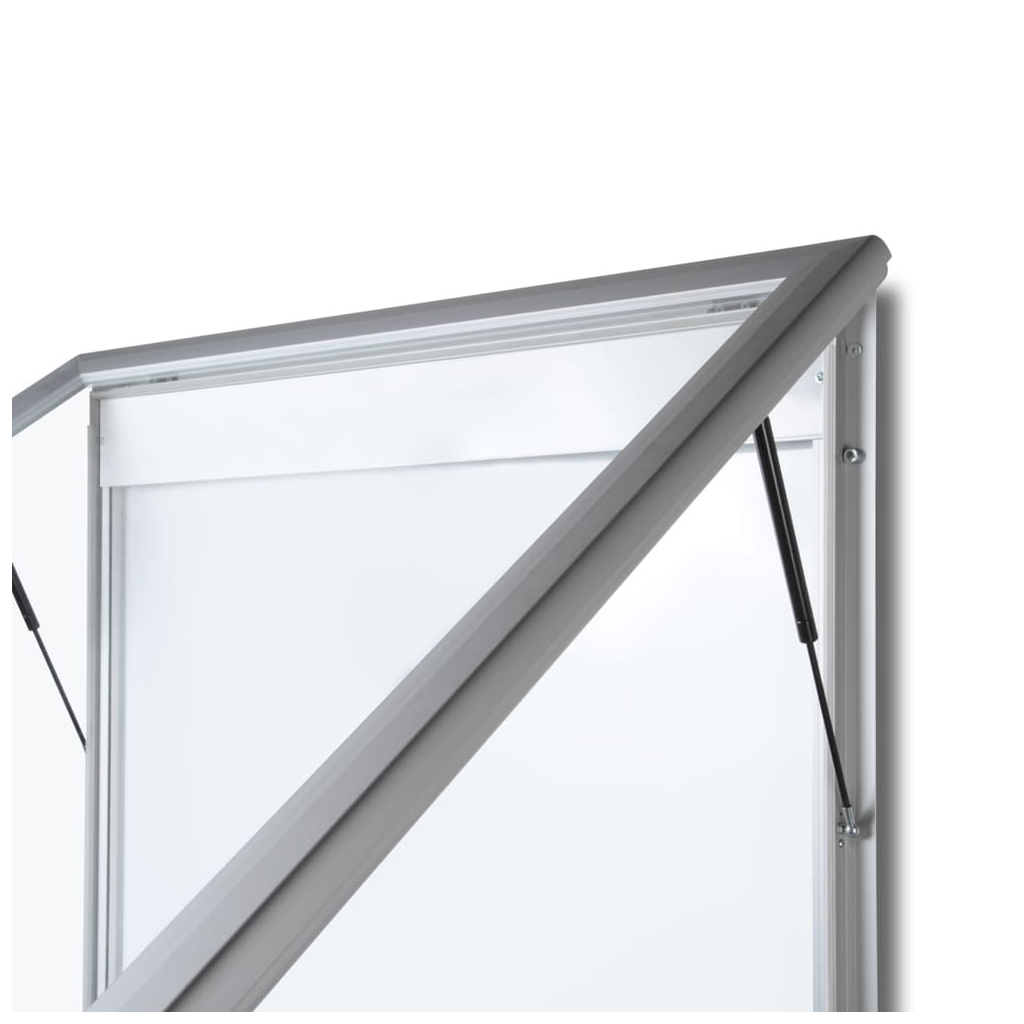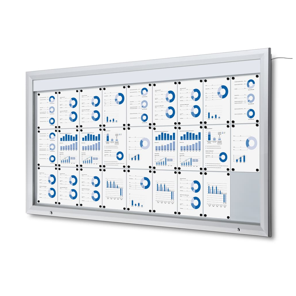 Vitrína ve formátu 27 x A4 disponuje magnetickým popisovatelným povrchem, který je nasvícen pomocí technologie LED. Vložený obsah se tak stane nepřehlédnutelným a kolemjdoucí spolehlivě zaujme i v noci. Povrch je určen pro popisování za sucha stíratelnými popisovači. Kromě psaní však můžete využít také magnetů pro připnutí všech důležitých dokumentů, které tak budete mít stále na očích.
