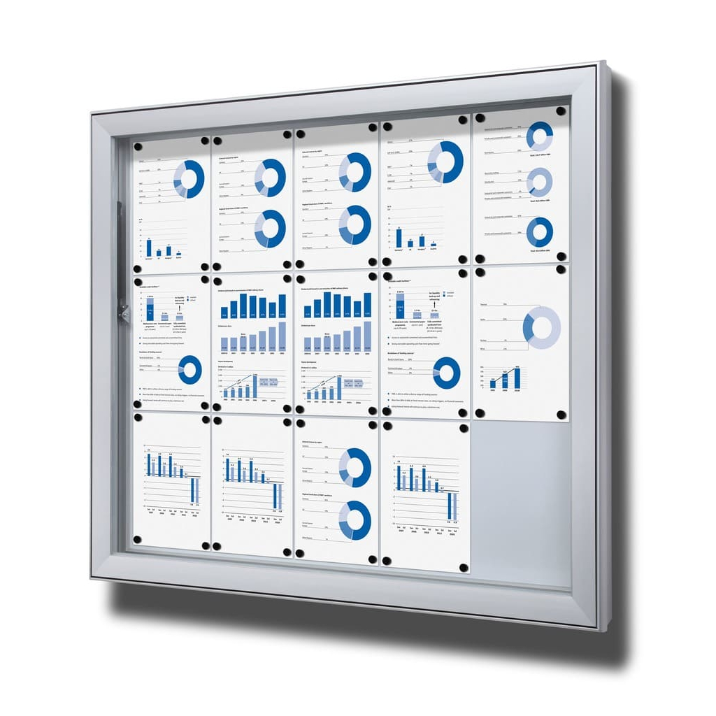 Vitrína ve formátu 15 x A4 disponuje magnetickým popisovatelným povrchem. Ten je určen pro popisování za sucha stíratelnými popisovači. Kromě psaní však můžete využít také magnetů pro připnutí všech důležitých dokumentů, které tak budete mít stále na očích.