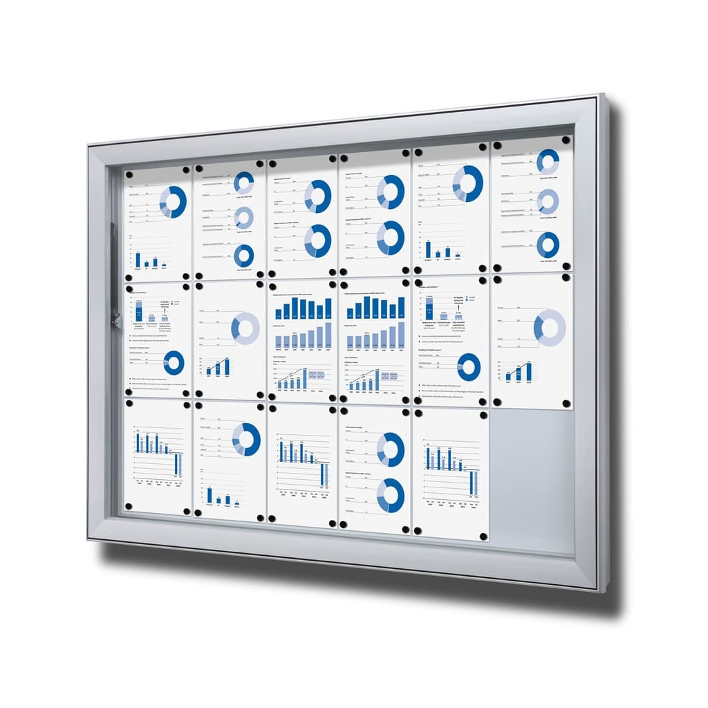 Vitrína ve formátu 18 x A4 disponuje magnetickým popisovatelným povrchem. Ten je určen pro popisování za sucha stíratelnými popisovači. Kromě psaní však můžete využít také magnetů pro připnutí všech důležitých dokumentů, které tak budete mít stále na očích.