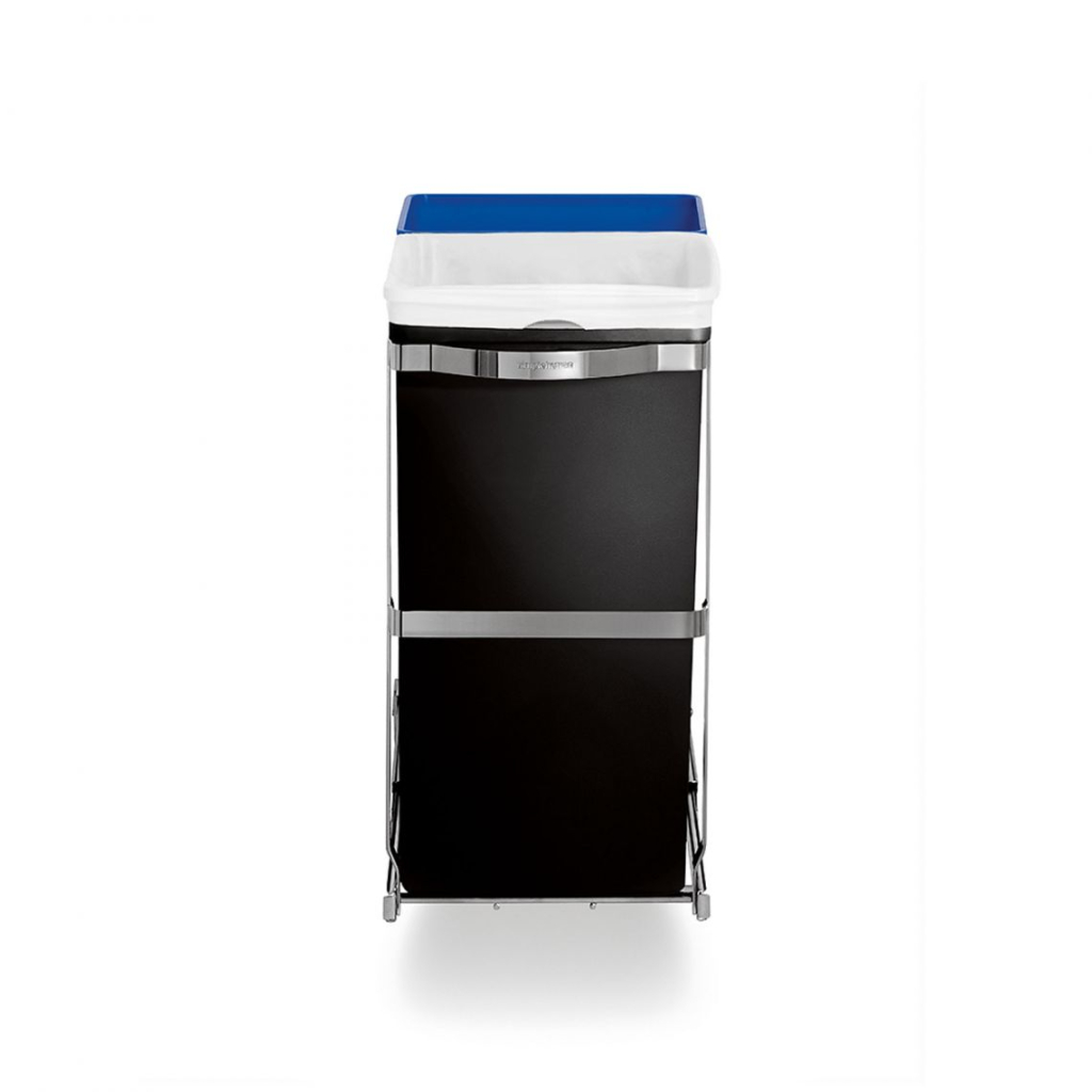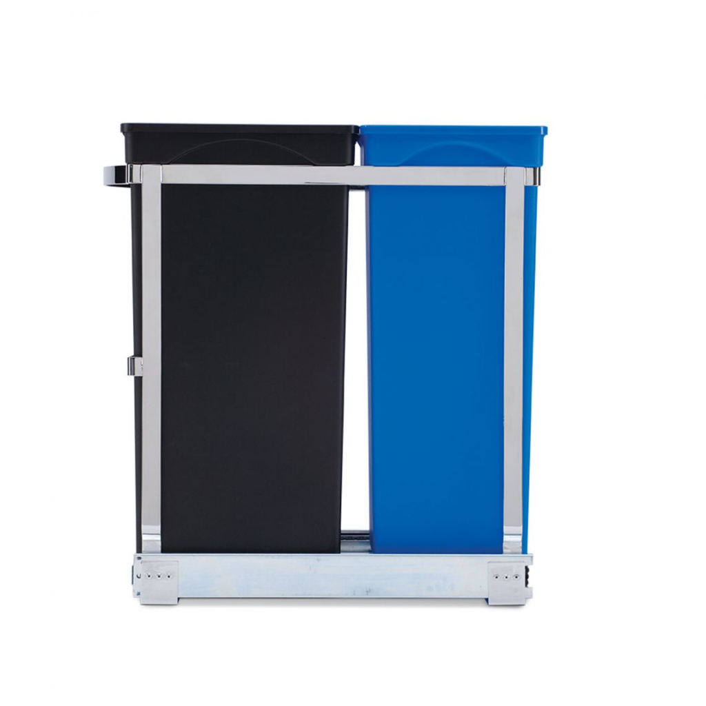 Výsuvný systém disponuje kuličkovými ložisky, které se postarají o jeho bezchybný, plynulý a tichý chod. Konstrukce je vyrobená z pevného tvrzeného plastu a lesklé nerezové oceli. Skládá se ze 2 barevně odlišených plastových nádob na tříděný odpad. Černá nádoba má objem 20 l, modrá 15 l. Konstrukci dodáváme smontovanou, stačí ji pouze přišroubovat ke dnu skříňky.