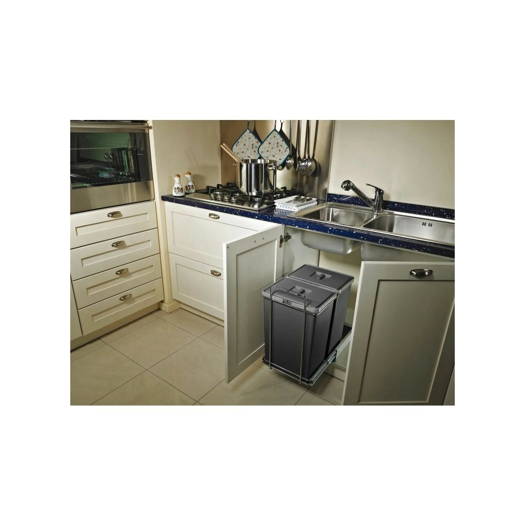 Koš je umístěný v rámu z chromované oceli a je opatřený víkem. Díky tomu se případný zápach nedostane ven. Umístěním např. ve skříni koš nenarušuje vzhled místnosti. Koš je navíc rozdělený drážkou na 2 části, do 1 nádoby tak můžete umístit 2 pytle na třídění odpadu.