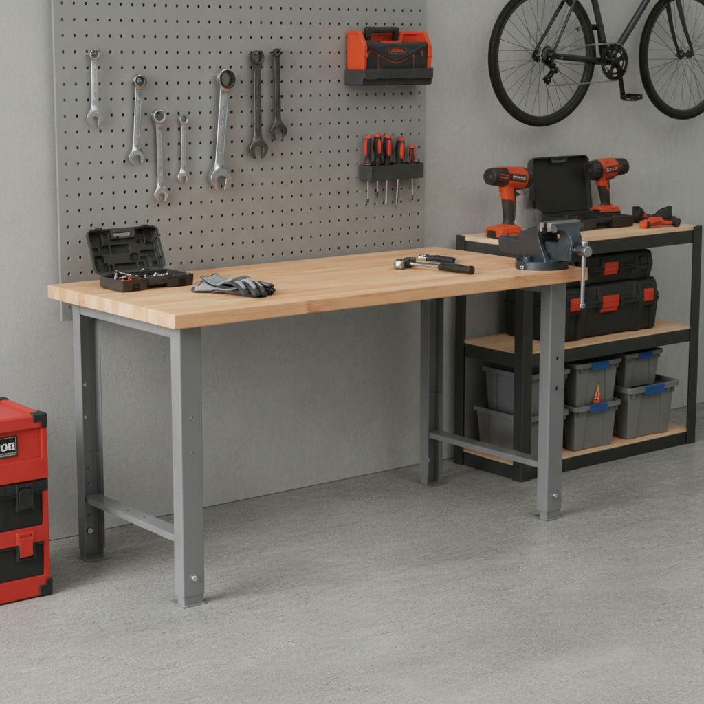 Horní deska dílenského stolu je vyrobena z masivní bukové spárovky o síle 40 mm. Stůl stojí na výškově stavitelné podnoži, jehož výšku si můžete nastavit v rozmezí od 84 do 104 cm, ve stupních po 5 cm. Podnož si můžete vybrat ze 2 barevných variant.