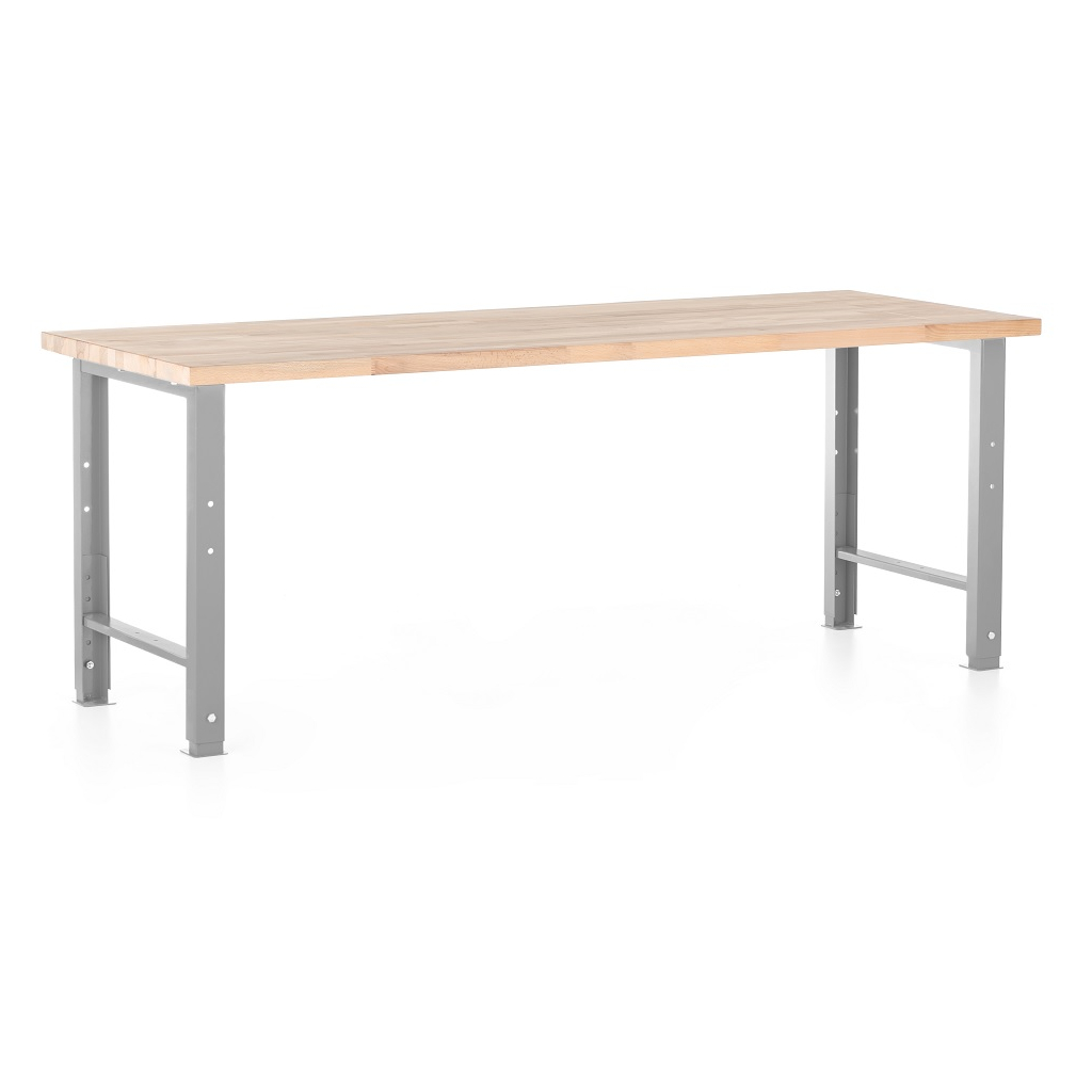 Horní deska dílenského stolu je vyrobena z masivní bukové spárovky o síle 40 mm. Stůl stojí na výškově stavitelné podnoži, jehož výšku si můžete nastavit v rozmezí od 84 do 104 cm, ve stupních po 5 cm. Podnož si můžete vybrat ze 2 barevných variant.
