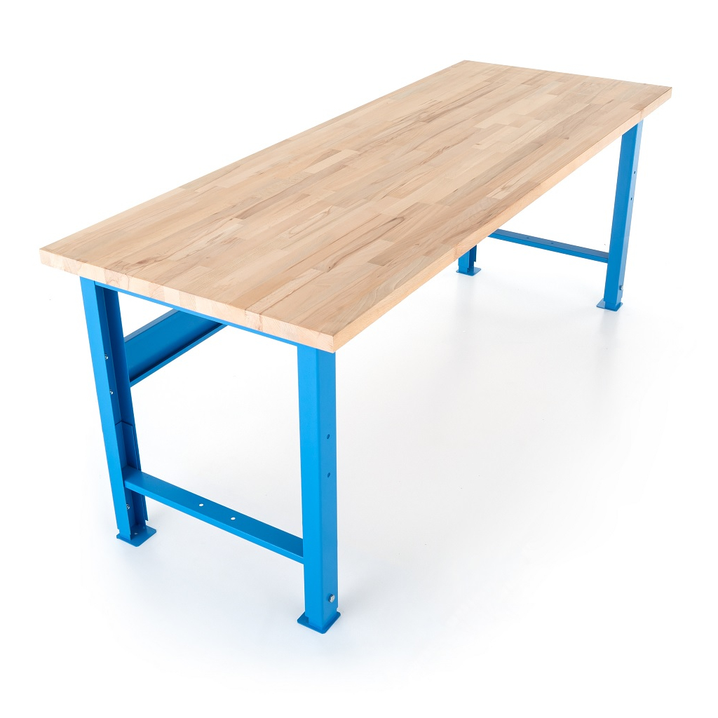 Horní deska dílenského stolu je vyrobena z masivní bukové spárovky o síle 40 mm. Stůl stojí na výškově stavitelné podnoži, jehož výšku si můžete nastavit v rozmezí od 84 do 104 cm, ve stupních po 5 cm. Podnož si můžete vybrat ze 2 barevných variant.