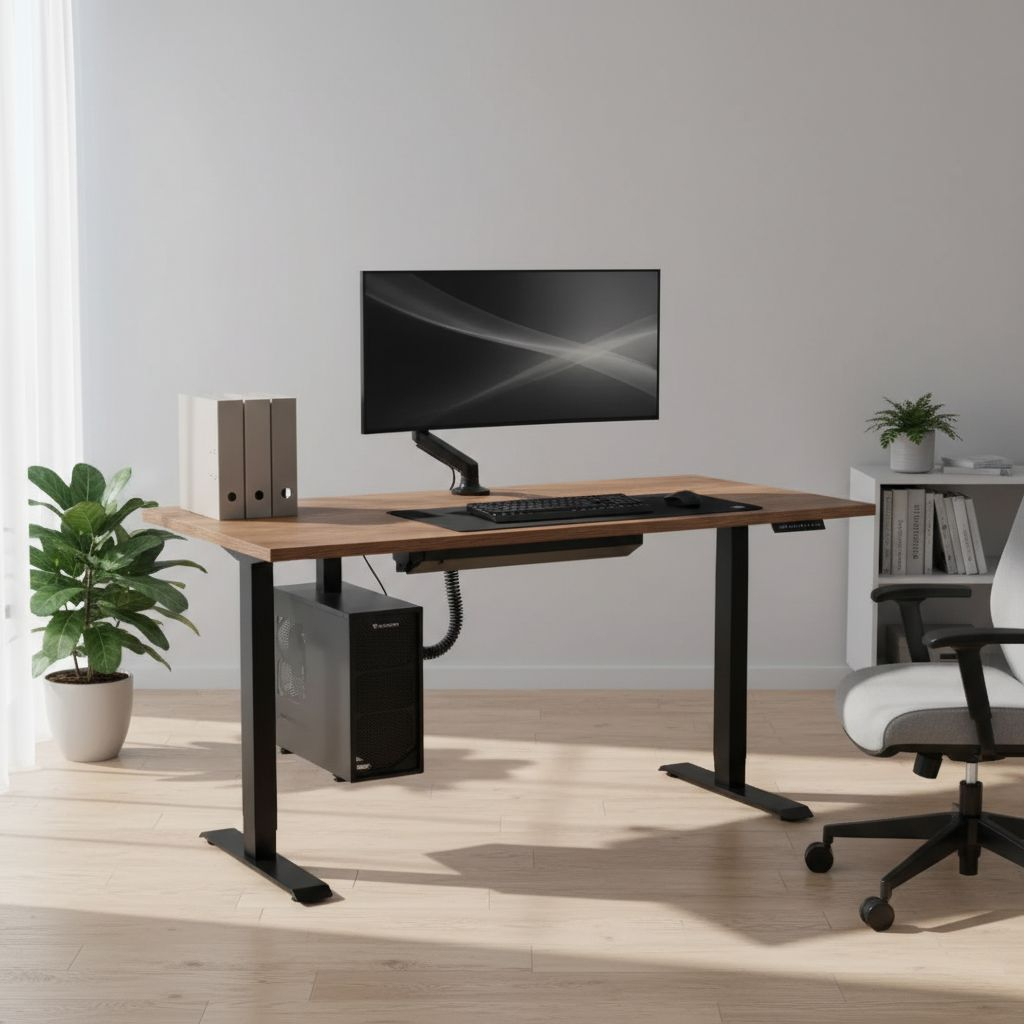 Desky těchto stolů jsou z laminované dřevotřísky s ochrannou ABS hranou. Kovové podnože mají variabilní délku a šířku bezmála 70 cm, což jim zaručí skvělou stabilitu. Napájení řeší kabel do klasické 230V zásuvky.