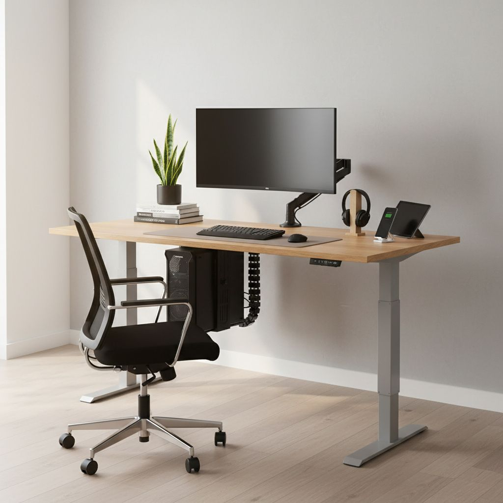 Desky těchto stolů jsou z laminované dřevotřísky s ochrannou ABS hranou. Kovové podnože mají variabilní délku a šířku bezmála 70 cm, což jim zaručí skvělou stabilitu. Napájení řeší kabel do klasické 230V zásuvky.