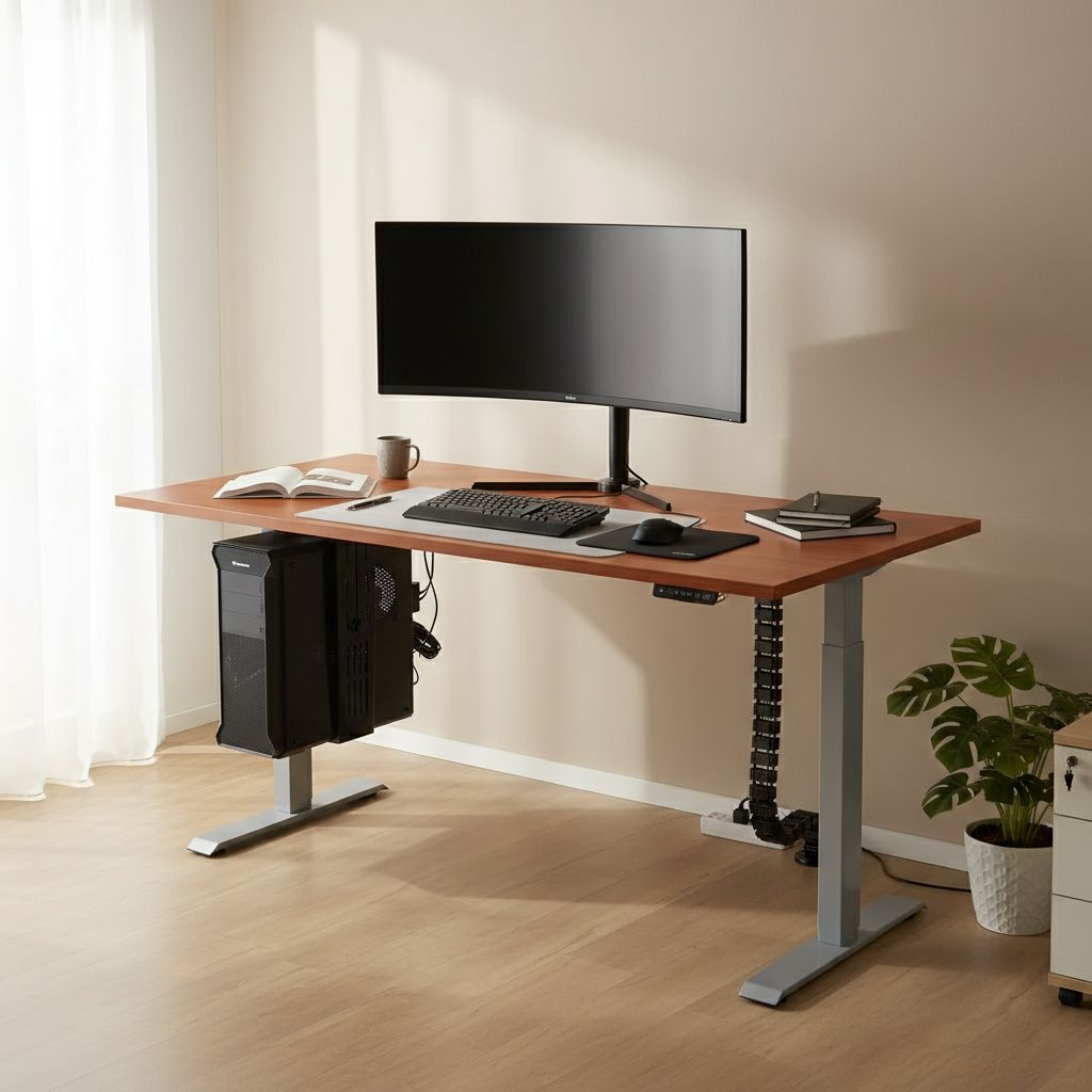 Desky těchto stolů jsou z laminované dřevotřísky s ochrannou ABS hranou. Kovové podnože mají variabilní délku a šířku bezmála 70 cm, což jim zaručí skvělou stabilitu. Napájení řeší kabel do klasické 230V zásuvky.