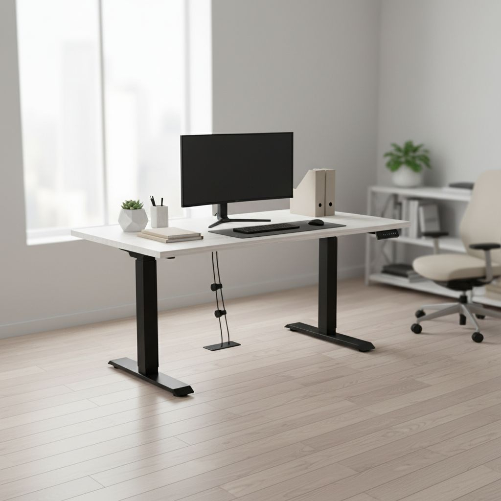Desky těchto stolů jsou z laminované dřevotřísky s ochrannou ABS hranou. Kovové podnože mají variabilní délku a šířku bezmála 70 cm, což jim zaručí skvělou stabilitu. Napájení řeší kabel do klasické 230V zásuvky.