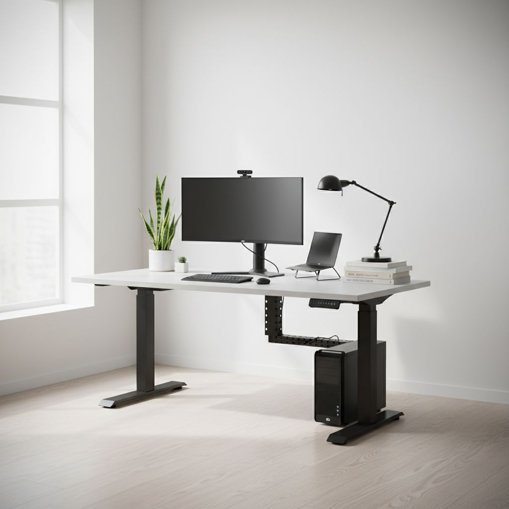 Desky těchto stolů jsou z laminované dřevotřísky s ochrannou ABS hranou. Kovové podnože mají variabilní délku a šířku bezmála 70 cm, což jim zaručí skvělou stabilitu. Napájení řeší kabel do klasické 230V zásuvky.