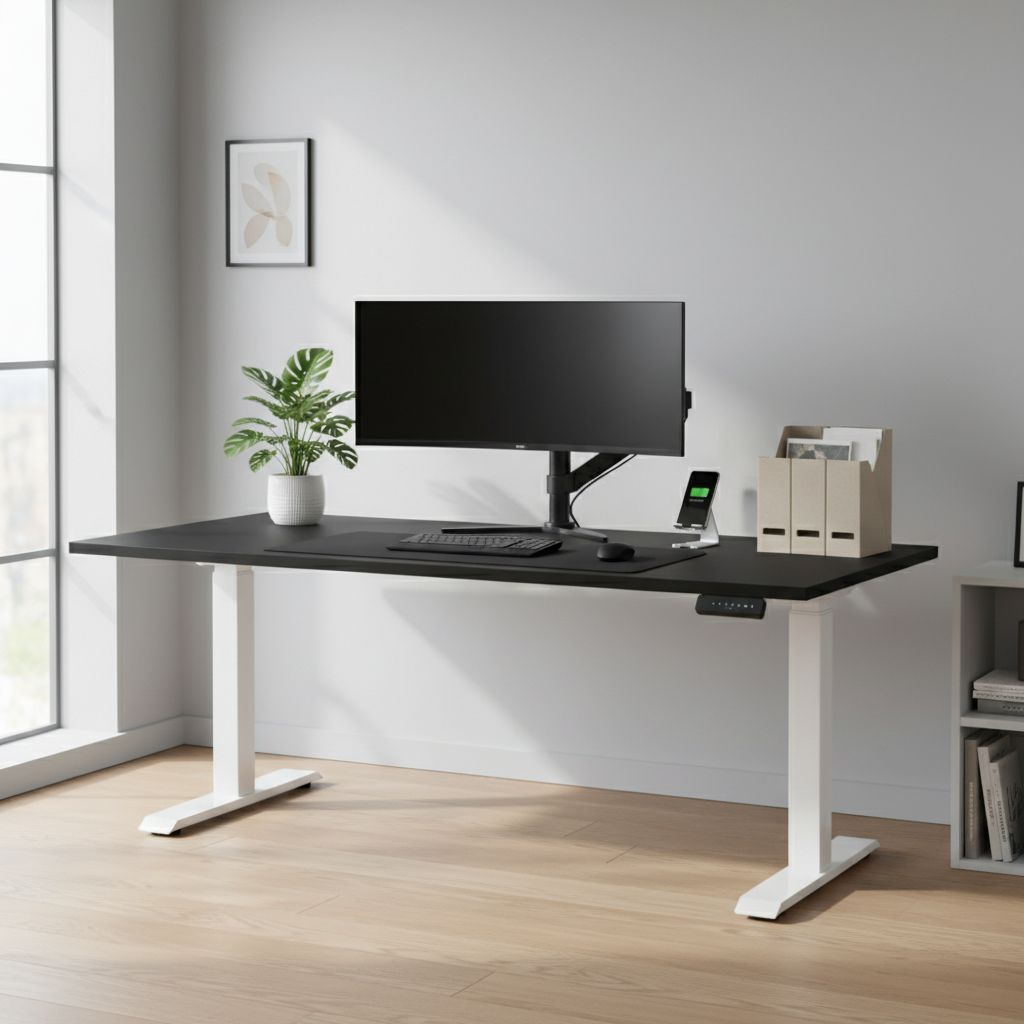 Když stůl při sjíždění do nižší polohy narazí na odpor (např. područku zasunuté židle), zastaví se. Nemusíte se tak bát poškození nábytku nebo spadnutí věcí ze stolu.