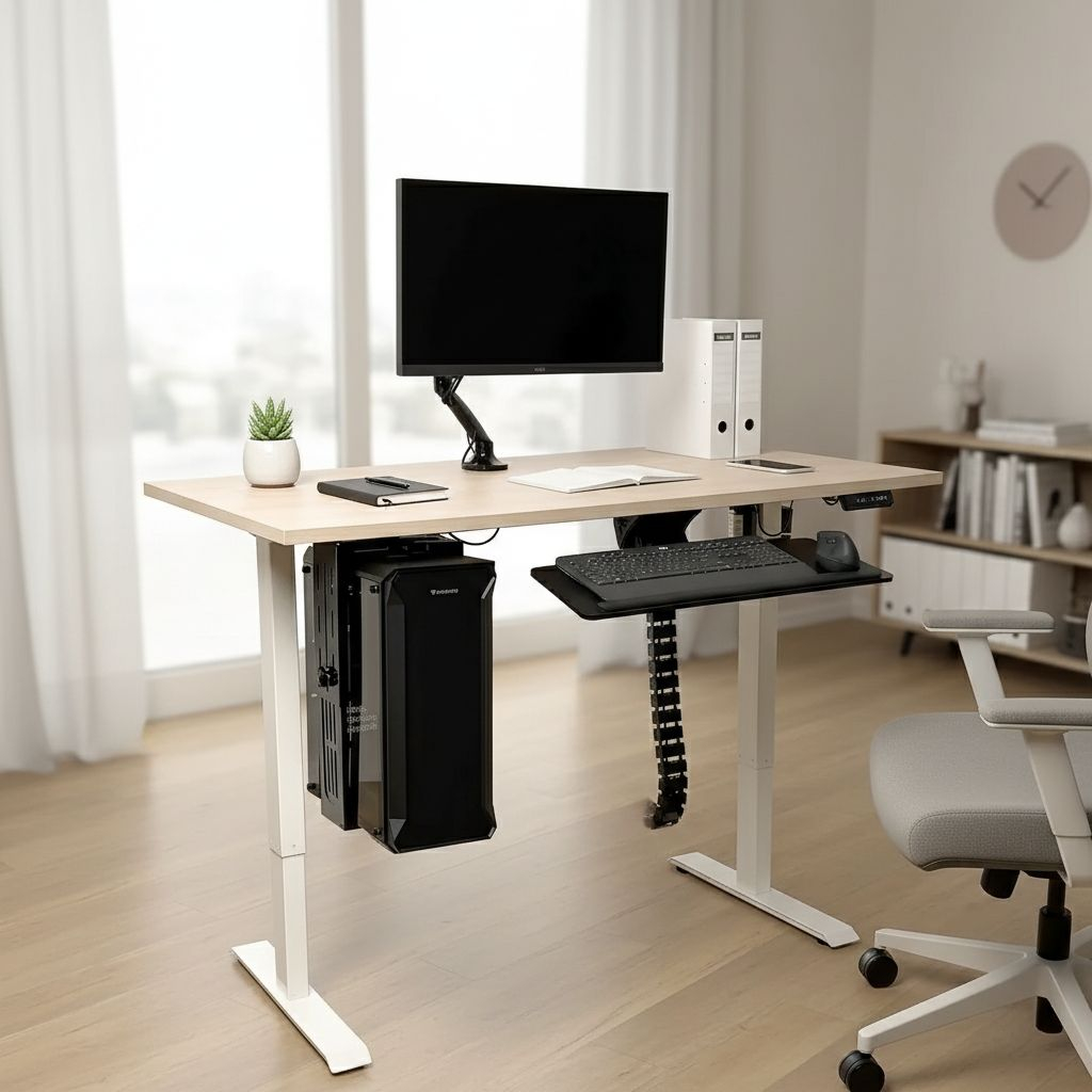 Desky těchto stolů jsou z laminované dřevotřísky s ochrannou ABS hranou. Kovové podnože mají variabilní délku a šířku bezmála 70 cm, což jim zaručí skvělou stabilitu. Napájení řeší kabel do klasické 230V zásuvky.