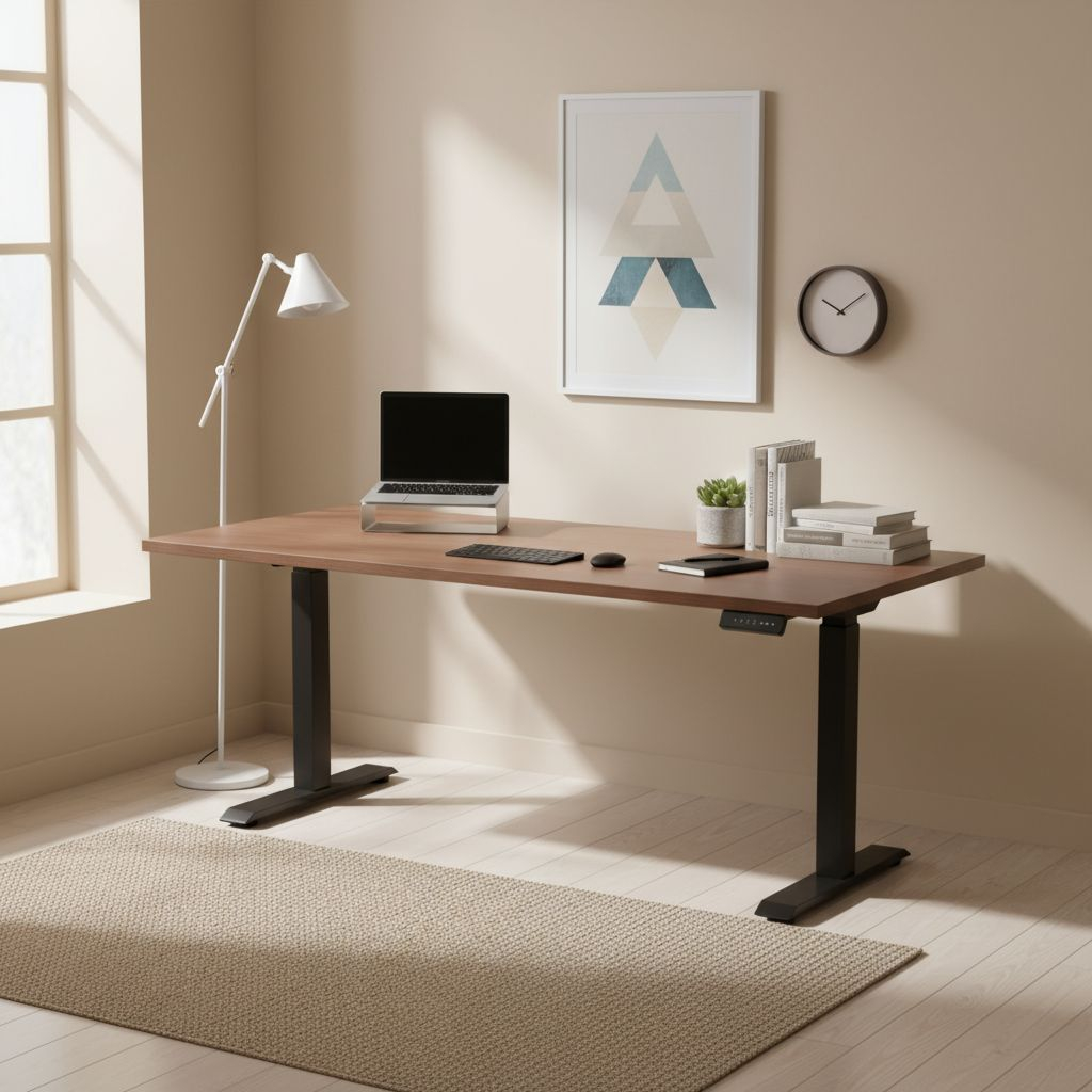 Desky těchto stolů jsou z laminované dřevotřísky s ochrannou ABS hranou. Kovové podnože mají variabilní délku a šířku bezmála 70 cm, což jim zaručí skvělou stabilitu. Napájení řeší kabel do klasické 230V zásuvky.