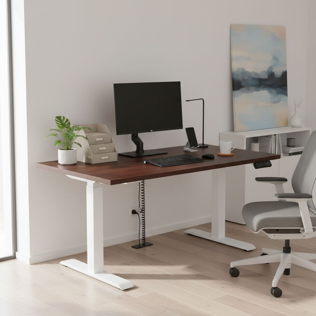 Desky těchto stolů jsou z laminované dřevotřísky s ochrannou ABS hranou. Kovové podnože mají variabilní délku a šířku bezmála 70 cm, což jim zaručí skvělou stabilitu. Napájení řeší kabel do klasické 230V zásuvky.