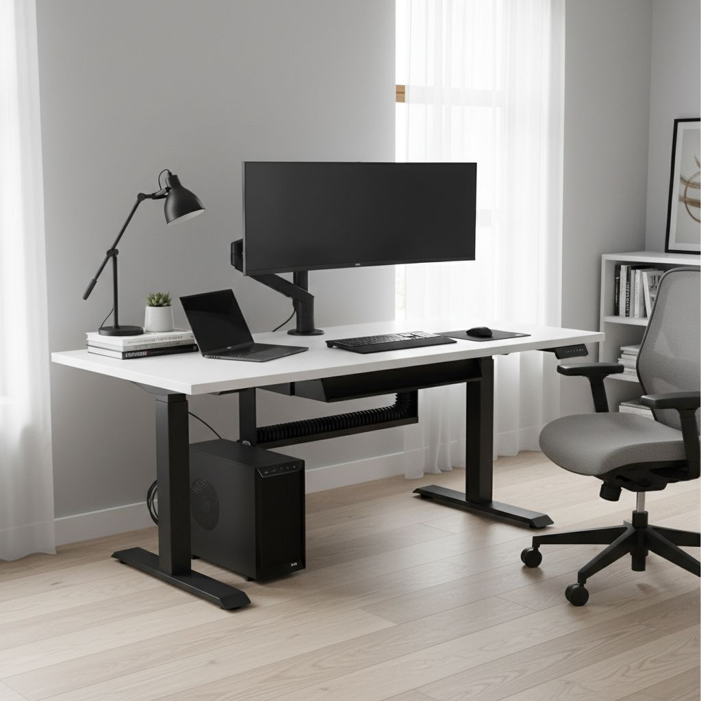 Desky těchto stolů jsou z laminované dřevotřísky s ochrannou ABS hranou. Kovové podnože mají variabilní délku a šířku bezmála 70 cm, což jim zaručí skvělou stabilitu. Napájení řeší kabel do klasické 230V zásuvky.