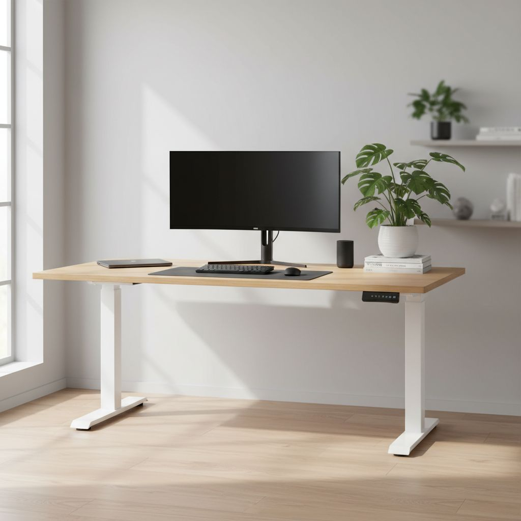 Desky těchto stolů jsou z laminované dřevotřísky s ochrannou ABS hranou. Kovové podnože mají variabilní délku a šířku bezmála 70 cm, což jim zaručí skvělou stabilitu. Napájení řeší kabel do klasické 230V zásuvky.